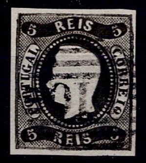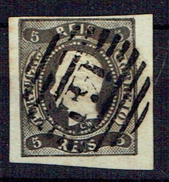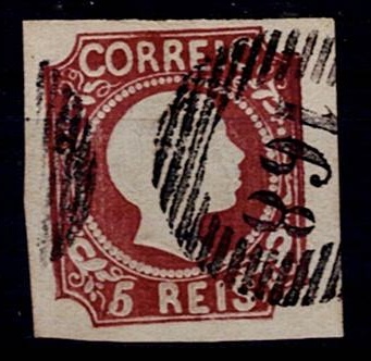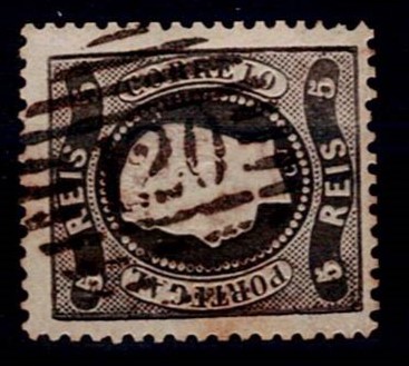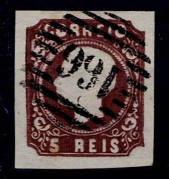 2157 imageMarcofilia Portugal numeric stamps from the 1st reform. 1866-67 D. Luis I, curved strip without notches. Mf#19, 5 réis, black, smooth paper. Used copy, with traces of oxide, with short to good margins, obliterated with a type 4-3-4 stamp beaten in black "141 – CASTELLO BRANCO”, well beaten.(Image 1)