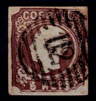 2153 imageMarcofilia Portugal numeric stamps from the 1st reform. 1862-64 D. Luis I, Borja Freire type. Mf#14, 5 réis, brown, smooth paper. Used copy, with traces of rust and a small tear in the upper right corner, obliterated with a 3-5-3 type stamp beaten in black "112 – VISEU”, well beaten.(Image 1)