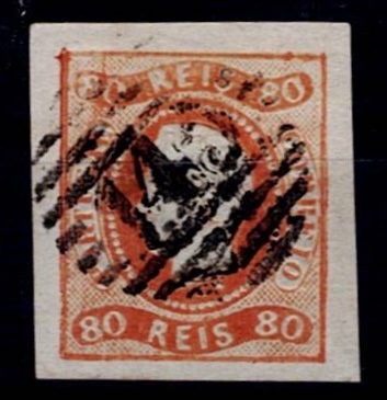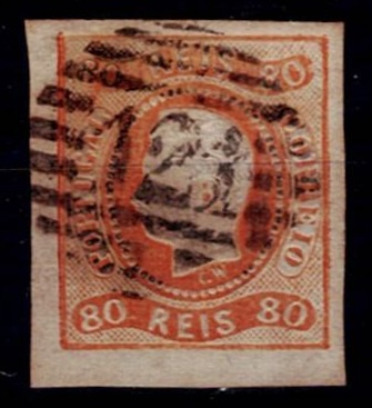 2155 imageMarcofilia Portugal numeric stamps from the 1st reform. 1866-67 D. Luis I, curved strip without notches. Mf#24, 80 réis, orange, smooth paper. Used copy, with head partially detached on the left side, with some dirt, obliterated with a 4-3-4 type stamp beaten in black "121 - LAMEGO”.(Image 1)