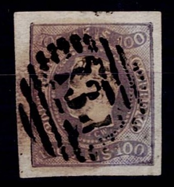 2149 imageMarcofilia Portugal numeric stamps from the 1st reform. 1855-56 D. Pedro, STRAIGHT hair. Mf#9, 100 réis, lilac, smooth paper. Used copy, without defects or repairs, obliterated with a 20-bar stamp, "108 – PONTE DA BARCA", rarity 3 Mundifil.(Image 1)