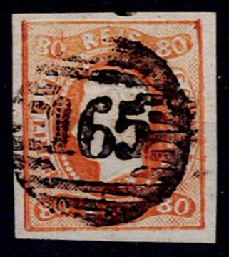 2160 imageMarcofilia Portugal numeric stamps from the 1st reform 1866-67 – D. Luís I. Curved band, no notches. Mf#24, 80 reis orange, smooth paper, no notches. Used copy, with good color and relief, without defects or repairs, obliterated with a 3-5-3 bar stamp struck in black "165 - ELVAS".(Image 1)
