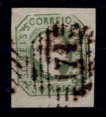 2163 imageMarcofilia Portugal numeric stamps from the 1st reform. 1855-56 D. Pedro STRAIGHT hair. Mf#8, 50 réis, green, smooth paper. Used copy, good to short margins, obliterated with a 4-3-4 type stamp struck in black "174 – VIEIROS / CAMPO MAIOR”, rarity 3 Mundifil.(Image 1)