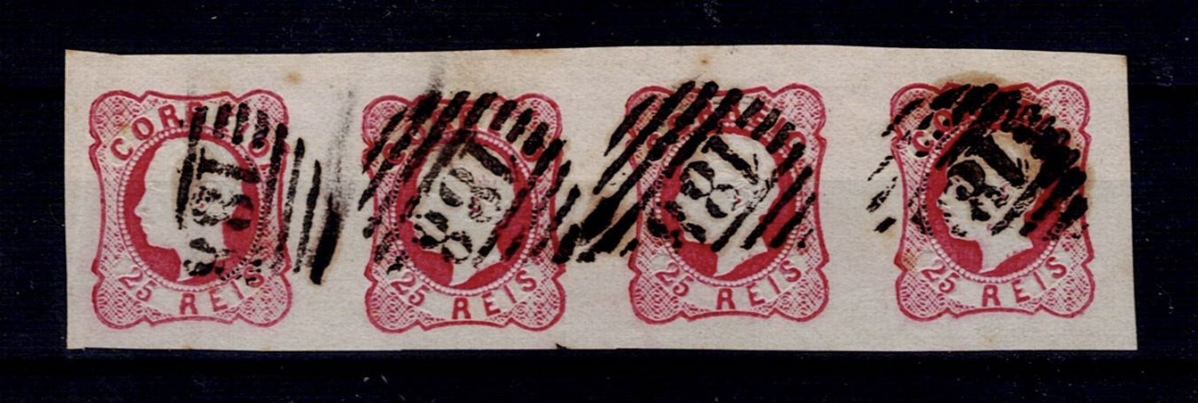 2165 imageMarcofilia Portugal numeric stamps from the 1st reform. 1862-64 D. Luis I, Borja Freire type. STRIP OF 4 HORIZONTAL of Mf#16, 25 réis, probably stamp IV, carmine color, smooth paper. Used copies, with traces of oxide, without repairs, obliterated with a 4-3-4 type stamp beaten in black "188 – SABROSA”.(Image 1)