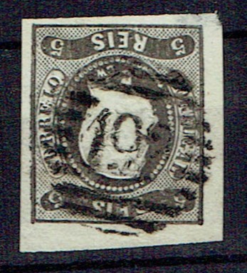 2166 imageMarcofilia Portugal numeric stamps from the 1st reform. 1866-67 D. Luis I, curved ribbon without notches. Mf#19, 5 réis, black, smooth paper. Used copy, with short to good margins, obliterated with a type 3-5-3 stamp beaten in black "192 – BEJA", well beaten.(Image 1)