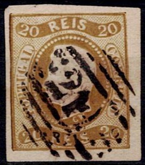 2167 imagePortugal * Numeric stamps from the 1st postal reform * 1866/67 – D. Luís I. Curved ribbon, not serrated. MF21, 20 réis, bistre, smooth paper, not serrated. Used copy, with 4 normal to good margins, without defects or repairs, obliterated with a black stamp “211 – CASTRO MARIM”, type 4-3-4, rarity 3 Mundifil.(Image 1)