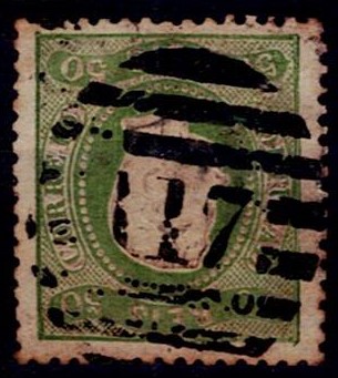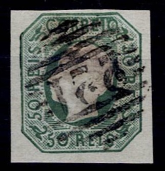 2180 imagePortugal * Numerical stamps from the 2nd postal reform * 1867/70 – D. Luís I. Curved ribbon, serrated. MF31, 50 réis, green, smooth paper, serrated. Used copy, in good colour, slightly dirty, without repairs, obliterated with a black stamp “117 – MIRANDELLA (Mirandela)”.(Image 1)