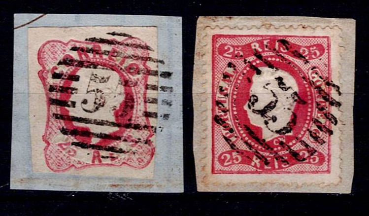 2169 imageMarcofilia Portugal numeric stamps from the 1st reform. 2 stamps 25 réis, pink carmine, D. Luis Borja Freire and curved ribbon obliterated with stamp from the 1st reform type 4-3-4 and 3-5-3, struck in black "55 - BEMPOSTA (ESTARREJA)", all rarity 2 Mundifil.(Image 1)