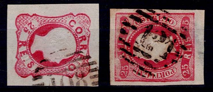 2170 imageMarcofilia Portugal numeric stamps from the 1st reform. 2 stamps 25 réis, pink carmine, D. Pedro and D. Luis curved ribbon not indented obliterated with stamps from the 1st reform type 4-3-4, struck in black "108 - PONTE DA BARCA" and "121 - LAMEGO", both rarity 2 Mundifil.(Image 1)