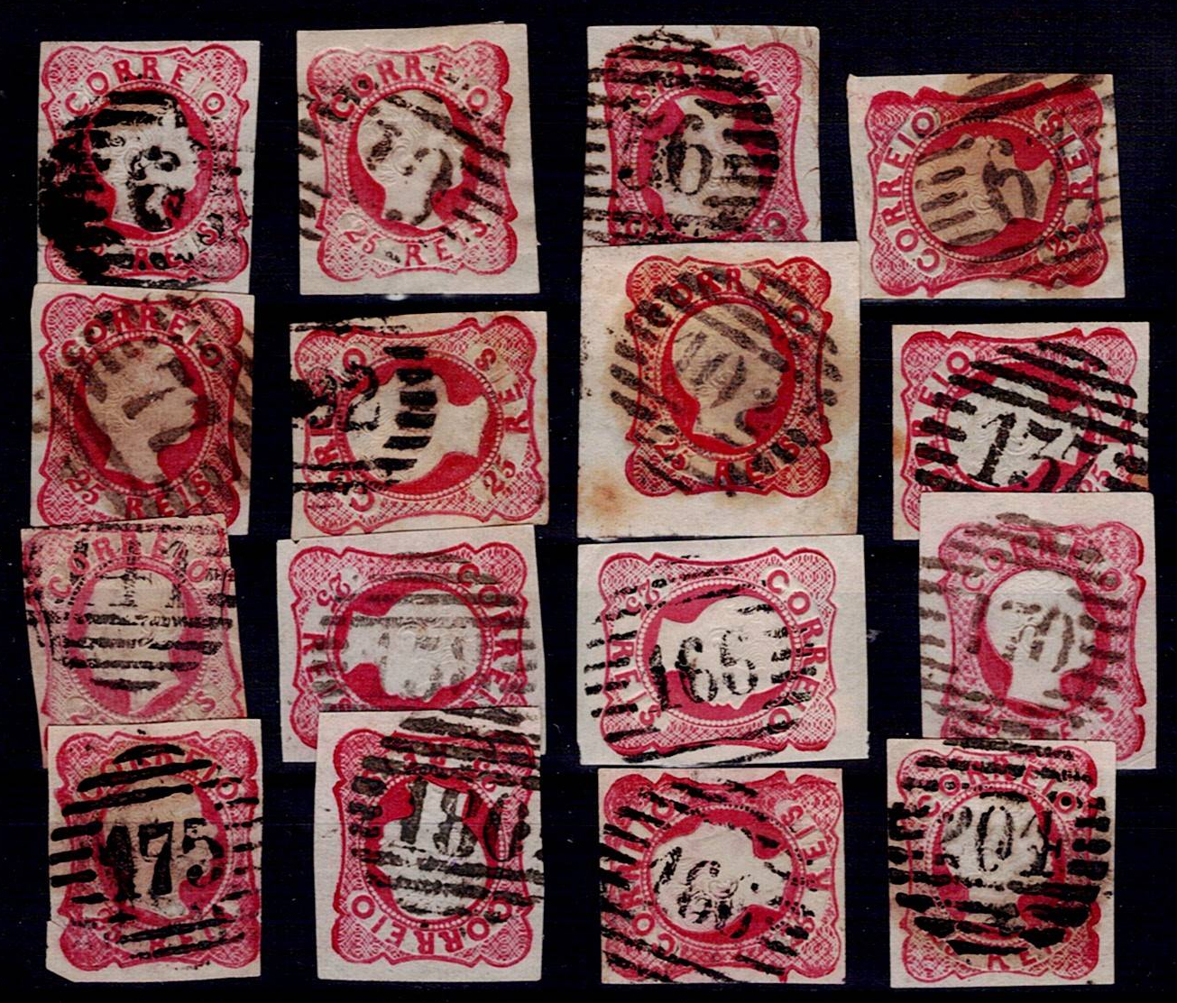 2171 imageMarcophilia. Set of 16 stamps of D. Pedro V, ringleted hair, 25 carmine kings with different bar stamps from the 1st reform: 6, 19, , 56, 67, 77, 92, 102, 137, 141, 158, 166, 170, 175, 180, 166, 204.(Image 1)