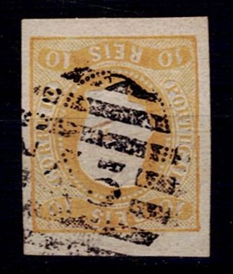 2173 imagePortugal * Numerical stamps from the 2nd postal reform * 1866/67 – D. Luís I. Curved ribbon, not serrated. MF20, 10 réis, yellow, smooth paper, not serrated. Used copy, with short to good margins, without defects or repairs, obliterated with a 2nd reform stamp beaten in black “43 – HORTA (FAIAL)”, precursors Azores. Well beaten.(Image 1)