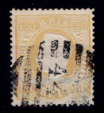 2174 imagePortugal * Numerical stamps from the 2nd postal reform * 1879-80 – D. Luís I. Straight ribbon, NEW COLOURS. MF51, 150 réis, YELLOW, 13.5 notches. Used copy, with good colour and relief, with horizontal thinning in the lower half of the stamp, obliterated with a black stamp “44 – PONTA DELGADA” (precursor Azores). Well beaten.(Image 1)
