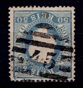 2175 imagePortugal * Numerical stamps from the 2nd postal reform * 1870-76 – D. Luís I. Straight-edge band. MF41, 50 réis, carmine, smooth paper, 13.5 notch. Used copy, with head detached on the right side, in good colour, obliterated with a black stamp “45 – FUNCHAL” (precursor). Well-beaten.(Image 1)
