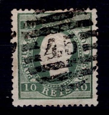 2168 imageMarcofilia Portugal numeric stamps from the 1st reform. 1862-64 D. Luis I, Borja Freire type. Mf#17a, 50 réis, GREEN BLUE color, smooth paper. Used copy, with good to short margins, without defects or repairs, obliterated with a 4-3-4 type stamp struck in black "221 – CANTANHEDE”, rarity 4 Mundifil.(Image 1)