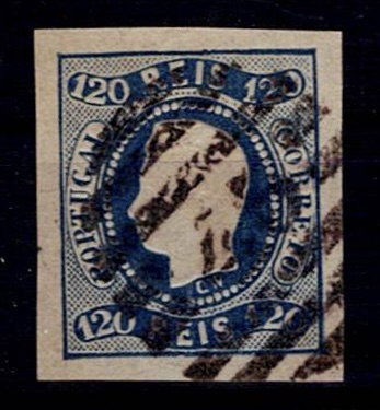 2181 imagePortugal * Numerical stamps from the 2nd postal reform * 1867/70 – D. Luís I. Curved ribbon, serrated. MF34, 120 réis, dark blue, smooth paper, serrated. Used copy, with very good colour and relief, without repairs, obliterated with a black stamp “129 – VISEU”. Very well beaten.(Image 1)