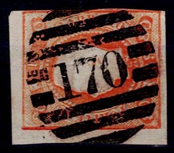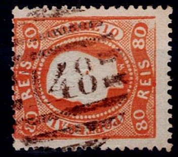 2183 imagePortugal * Numerical stamps from the 2nd postal reform * 1866/67 – D. Luís I. Curved ribbon, not serrated. MF24, 80 réis, orange, smooth paper, not serrated. Used copy, with good colour and relief, without defects or repairs, with 2 very good margins, 1 short and 1 cutting the frame, obliterated with a black stamp “170 – COVILHÔ.(Image 1)