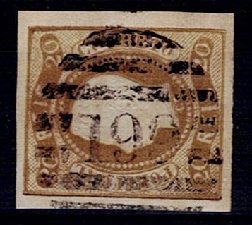 2185 imagePortugal * Numerical stamps from the 2nd postal reform * 1866/67 – D. Luís I. Curved ribbon, not serrated. MF21, 20 réis, bistre, smooth paper, not serrated. Used copy, without defects or repairs, with 4 good margins, obliterated with a black stamp “199 – MÉRTOLA”. Well-beaten.(Image 1)