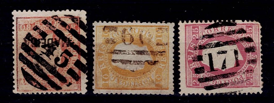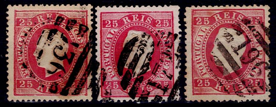 2187 imageMarcofilia Portugal numeric postmarks from the 2nd reform. 1870-76 D. Luis, right band. 3 stamps Mf#40, 25 réis, pink carmine, obliterated with postmarks from the 2nd reform struck in black "136 - GOUVEIA", "172 - ELVAS" and "196 - CUBA (Alentejo)", all rarity 2 Mundifil.(Image 1)