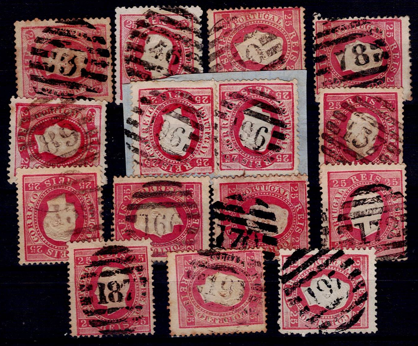 2188 imageMarcofilia. Set of 15 D. Luis stamps, right ribbon, 25 reis carmine, with different bar stamps from the 2nd reform: 3, 46, 50, 78, 89, 196, 157, 159, 166, 170, 172, 187, 191 and 197.(Image 1)