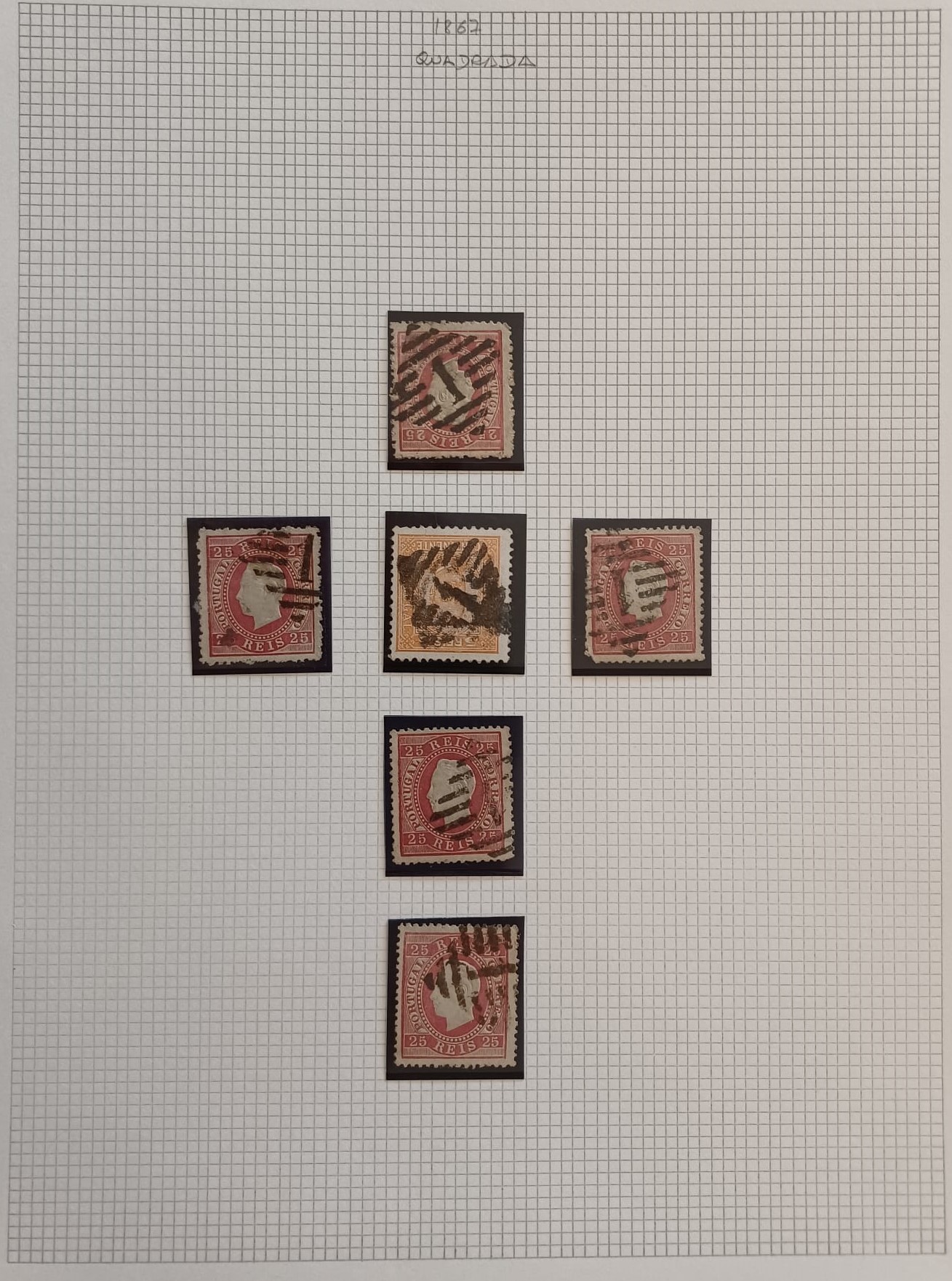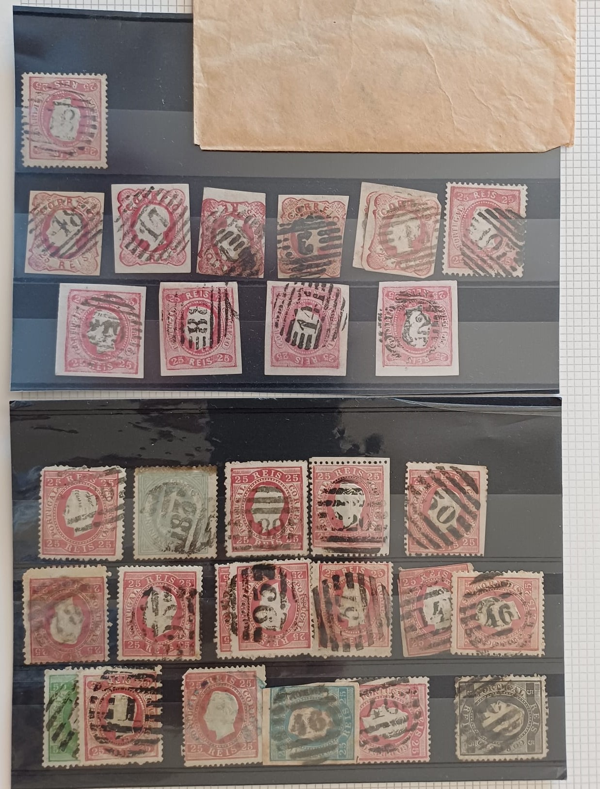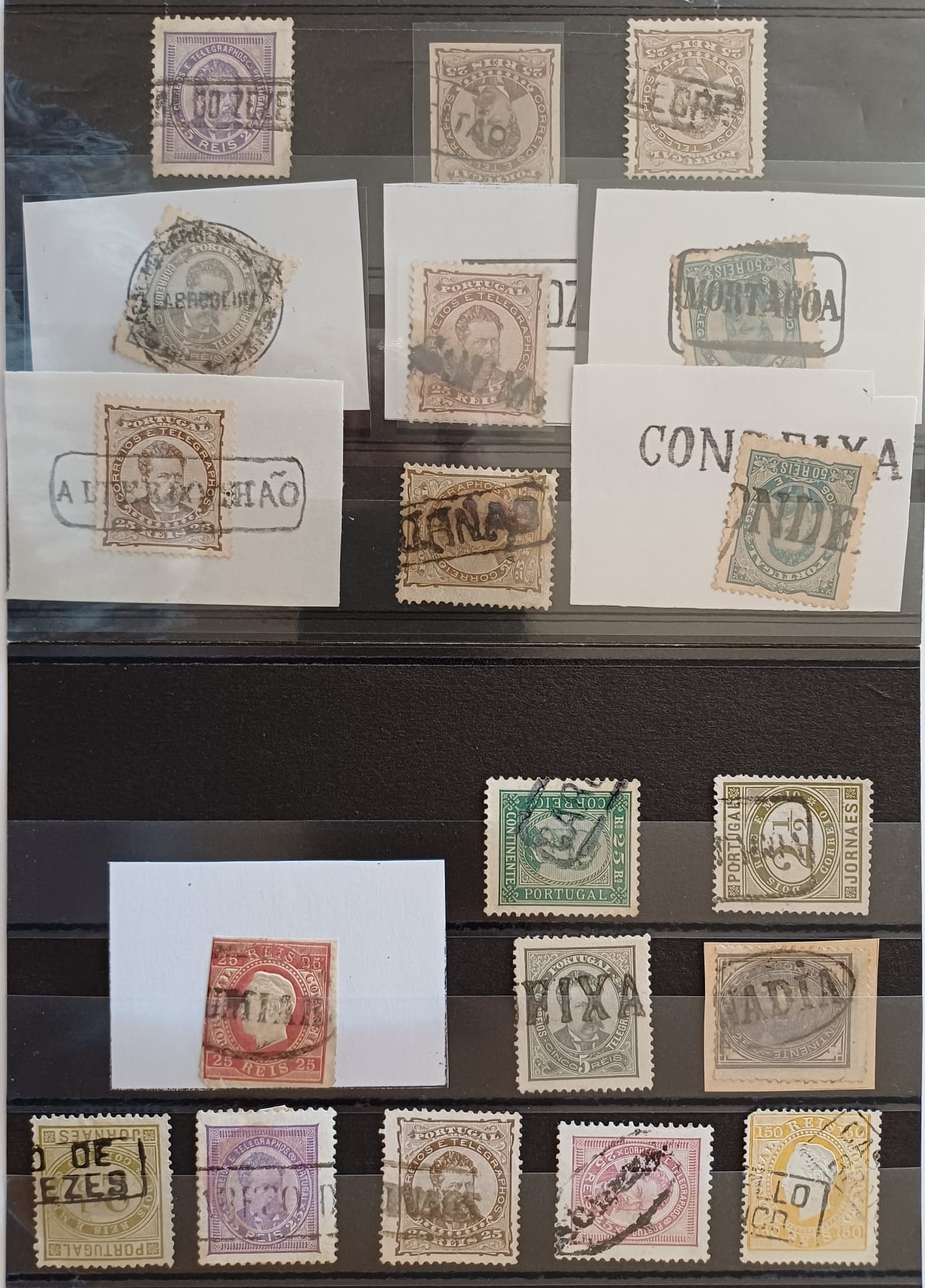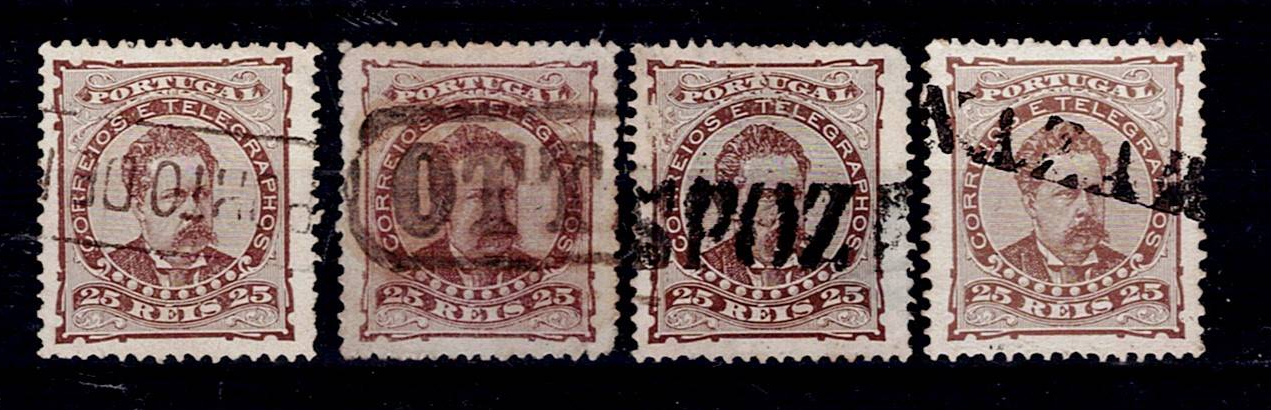 2198 imageMarcophilia, nominal stamps. 4 stamps D Luis I, front Mf#57, 25 reis, with stamps "PORTO DE M[ós]", "OTT...", "ESPOZENDE", and "NAZAR[ETH)".(Image 1)
