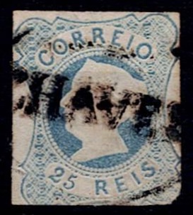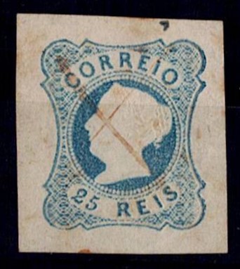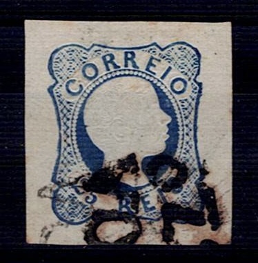 2197 imagePortugal * Nominal / nominative stamps * 1856-58 – D. Pedro V, curly hair. MF12, 25 réis, blue, smooth paper, not serrated. Used copy, good to short margins, with good colour, thinned on the lower left margin, obliterated with a black stamped nominal stamp “VALLADA[RES]”, incomplete.(Image 1)