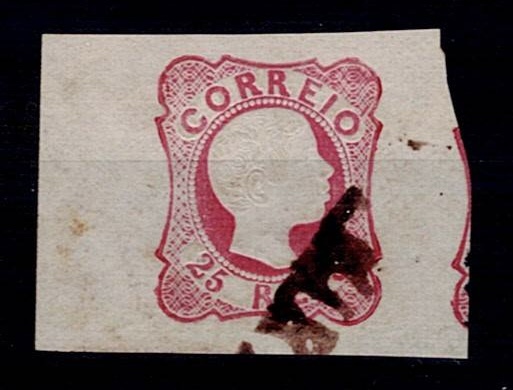 2191 imagePortugal * Nominal / nominative stamps * 1856-58 – D. Pedro V, curly hair. BORDO DE FOLHA stamp of MF13, 25 réis, carmine, smooth paper, no notches. Used copy, luxury margins, in good colour, with a small detachment from the frame and traces of rust, obliterated with a black stamped nominal stamp “[...] AR [...]” incomplete and illegible.(Image 1)
