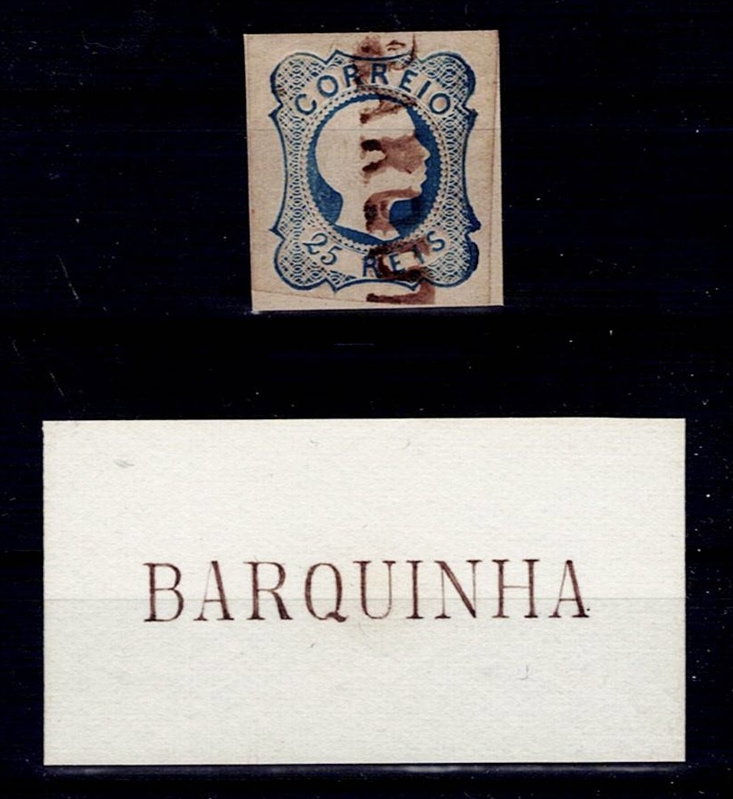 2192 imagePortugal * Nominal / nominative stamps * 1855-56 – D. Pedro V, straight hair. MF7, 25 réis, blue, smooth paper, no notches. Used copy, with good colour and relief, attached to a fragment of paper with a hinge, without defects or repairs, obliterated with an incomplete black stamp “BARQUI[NHA]”. Comes with a drawing of the complete stamp.(Image 1)