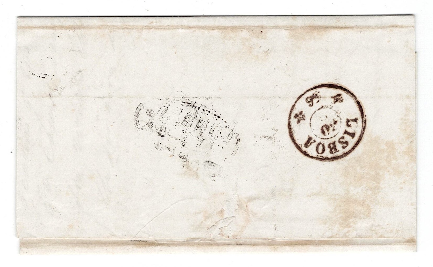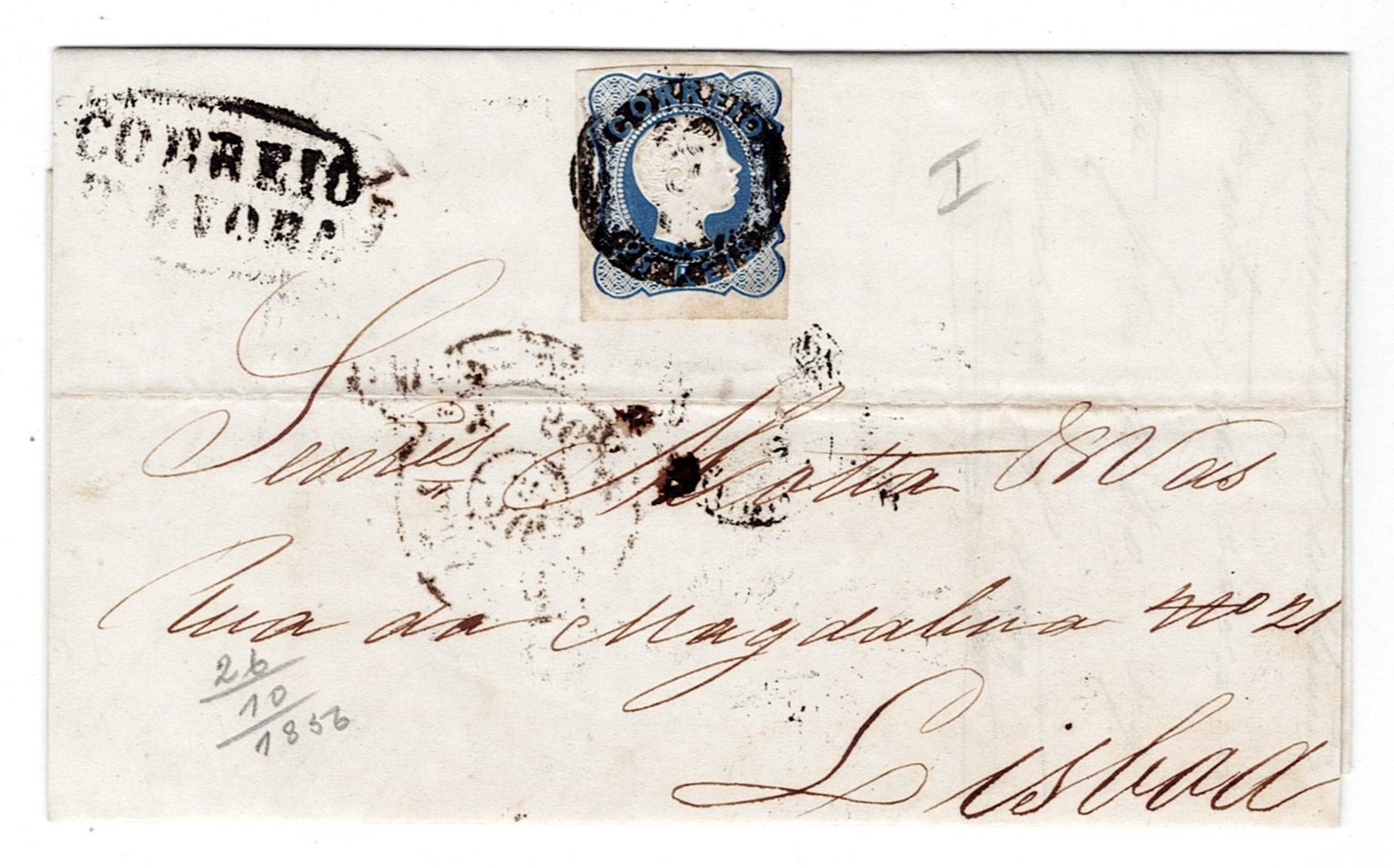 2194 imagePostmarks. Portugal. Issue of D. Pedro, curly hair, Mf#12. Blue 25 reis stamp, on letter from Evora, with oval postmark "CORREIO DE EVORA" in black, 26.10.1856 to Lisbon.(Image 1) (Image 2)