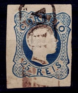 2196 imagePortugal * Nominal / nominal stamps * 1856-58 – D. Pedro V, curly hair. MF12, 25 réis, blue, smooth paper, not serrated. Used copy, with good colour and relief, with traces of rust and 2 thinnings at the top, obliterated with a nominal stamp beaten in black “[POV]OA[FROM THE LANHO]ZO” incomplete.(Image 1)