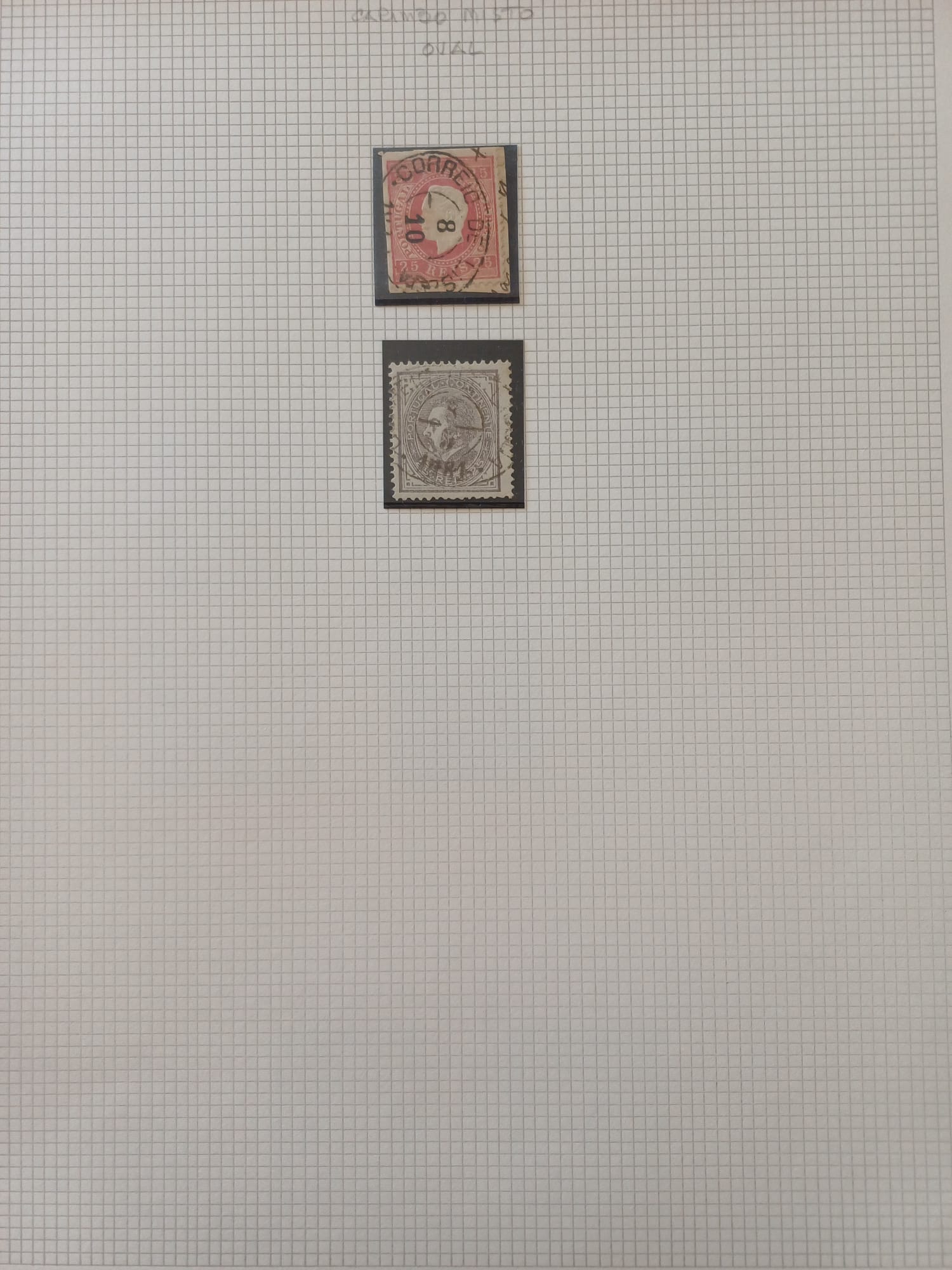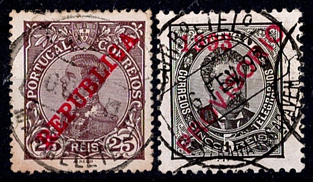 2204 imagePortugal * Dated circular stamps, type 1880 * 1892/1910 – D. Luís I. Overprints “PROVISORIO” + D. Manuel II with overprint “REPUBLICA”. MF89, 5 réis, black + MF175, 25 réis, brown. Used stamps, without defects or repairs, in good color, obliterated with stamps beaten in black “ESTADA DE SACAVÉM” and “MARMELETE”.(Image 1)
