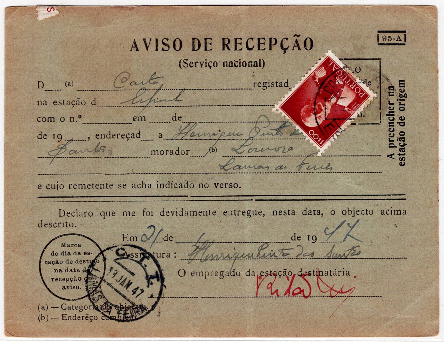2203 imagePortugal. Republic. Printed Receipt Notice, postage of 1$00, of a registered letter sent from Espinho to Lamas da Feira on 13 January 1947.(Image 1)