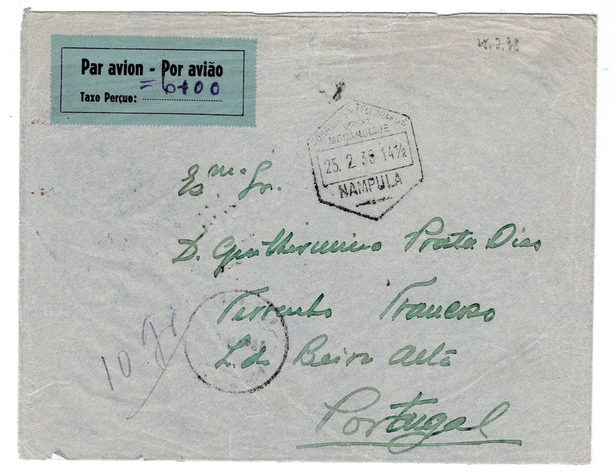 204 imageAirmail. Letter dimensions with fee received by plane par avion impresso porte of 6$00 to Lisbon, sent from Nampula on 25/02/1938, arrival in Lisbon on 26/02/38. MR and MB(Image 1)