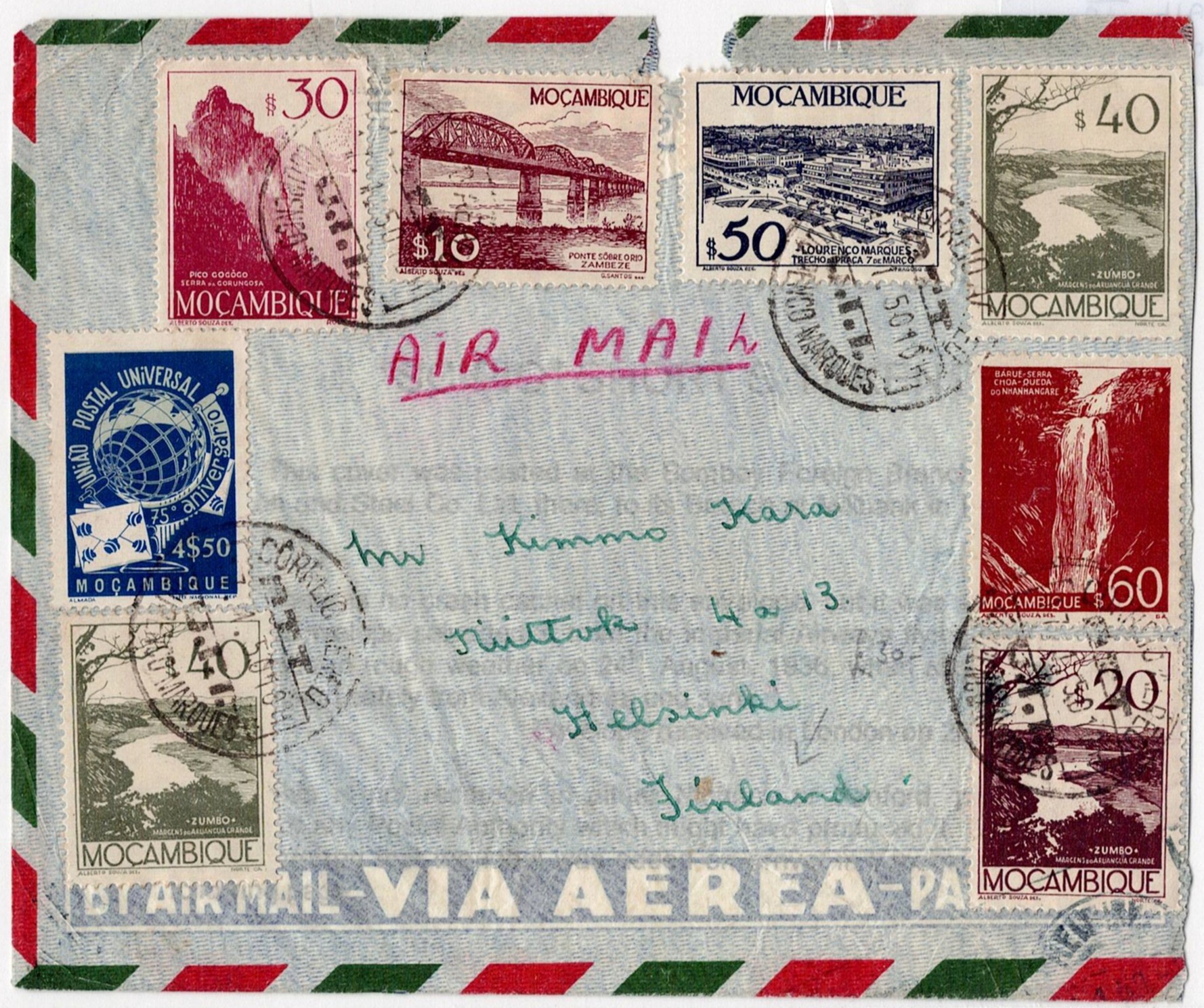 205 imageMozambique. Letter sent by airmail from Lourenço Marques on January 7, 1950 to Helsinki, postage of $7.00(Image 1)