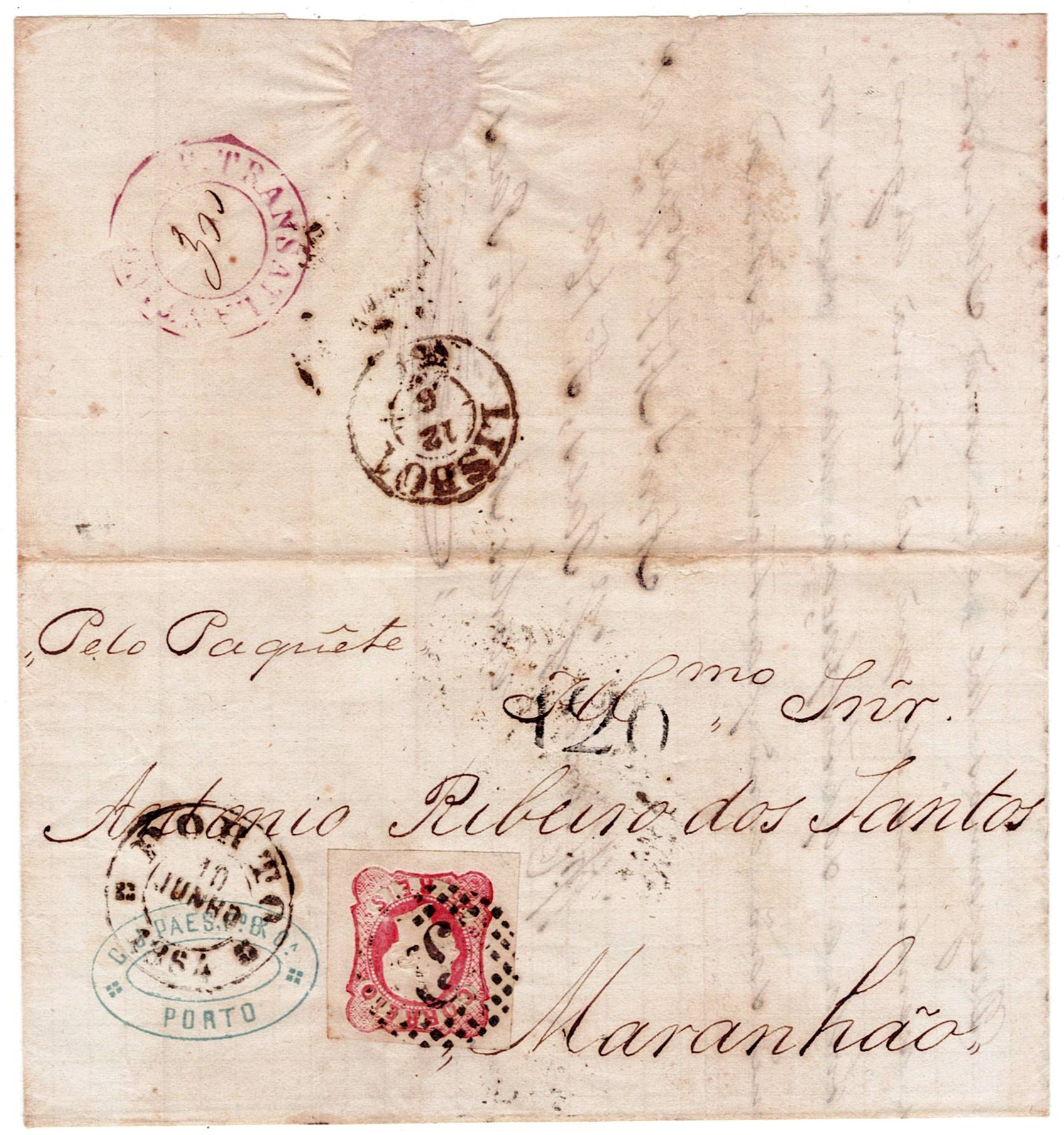 206 imagePortugal/Brazil Sea Mail. Letter sent from Porto on 10 June 1864 to Maranhão, postage of 25 reis D. Pedro to pay postage to Lisbon, 12 June, marked Transatlantic Package 300 reisIt also has a printed postage of 120 reis on the front. . RARE(Image 1)