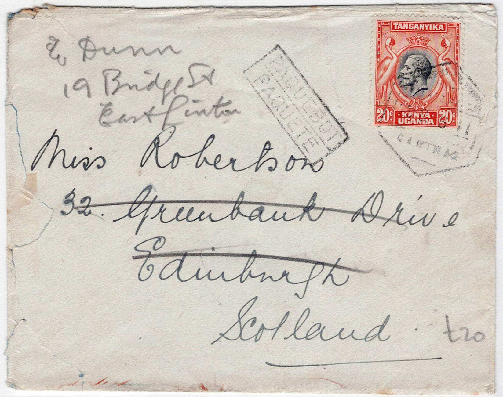 207 imageSea Mail. Mozambique. Letter sent from Tanganyika, 20-cent postage, by Lourenço Marques, June 29, 1925, where the stamp was obliterated, the PAQUETE/PAQUEBOT mark applied, from where it continued to Scotland.(Image 1)