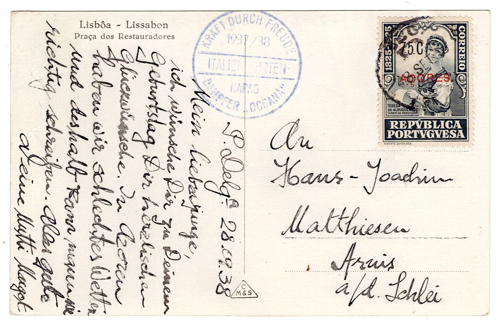 208 imageAzores. Illustrated postcard, 75-cent postage, sent from Ponta Delgada on September 28, 1938, by the German steamer "Oceania", to Germany.(Image 1) (Image 2)