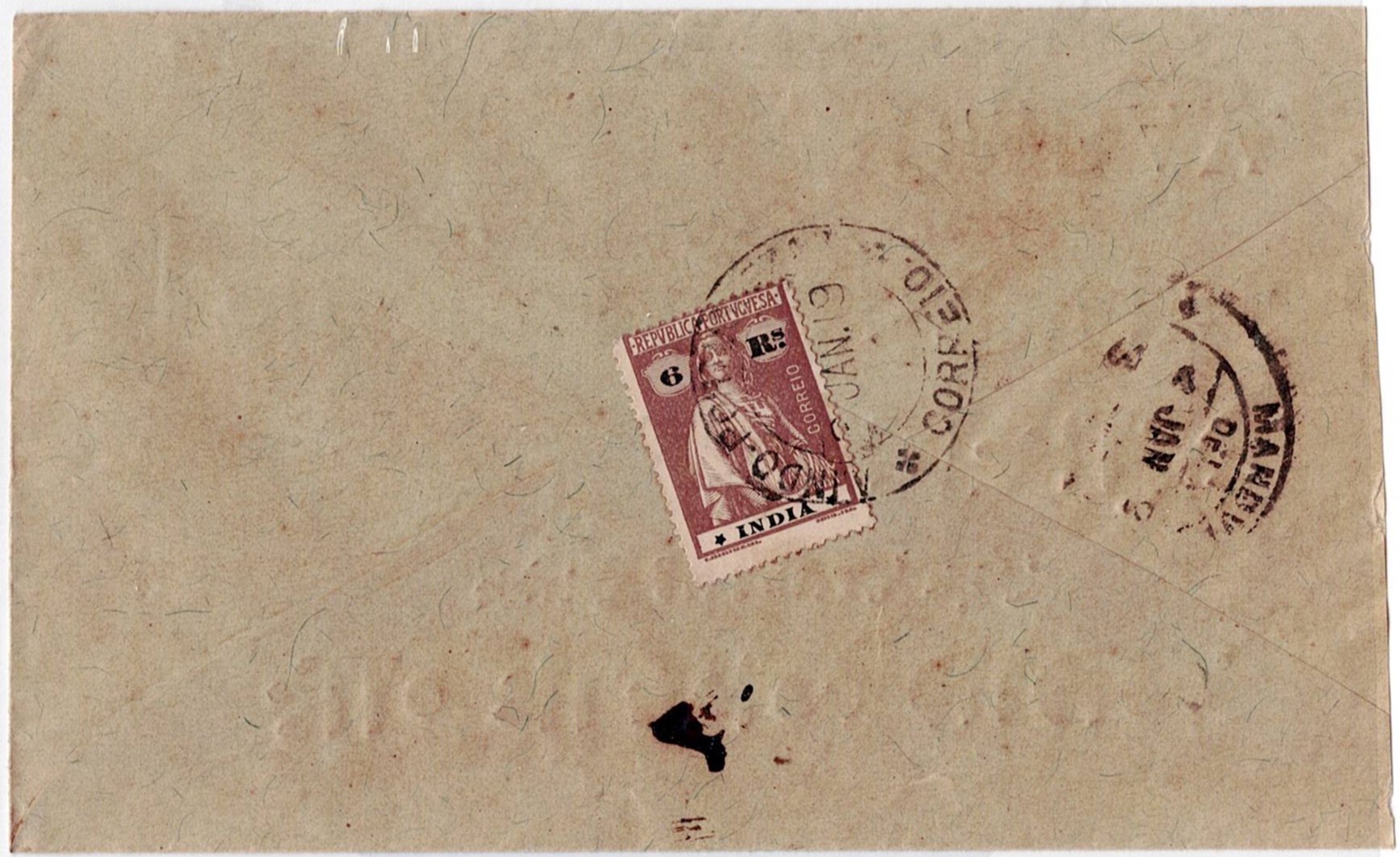 209 imageRailway mail. Letter from Portuguese India, six reais postage, Ceres stamp with obliterationIndo-Portuguese ambulance mail January 3, 1919to Bombay. MB and MR(Image 1)