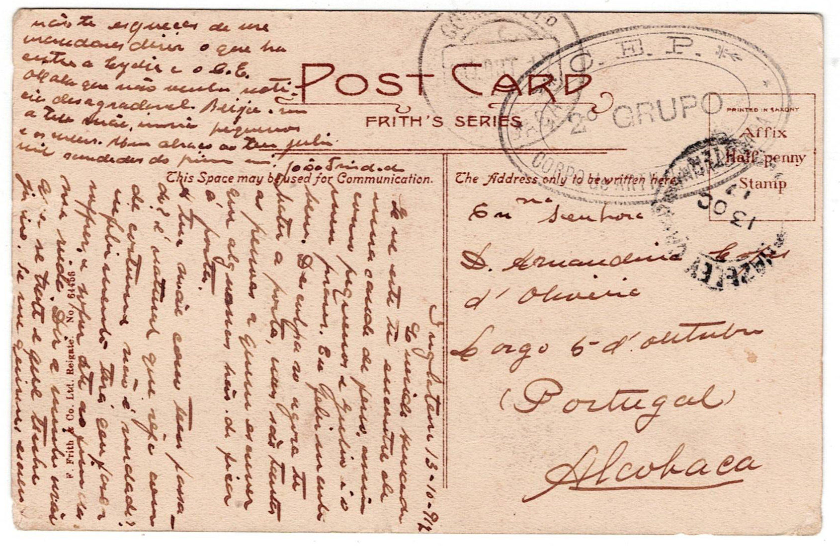 211 imageMilitary Mail. WW1. England. Portugal. Postage-free postcard, sent by a member of the CEP in England, 2nd group, on 13 October 1917, to Alcobaça(Image 1)