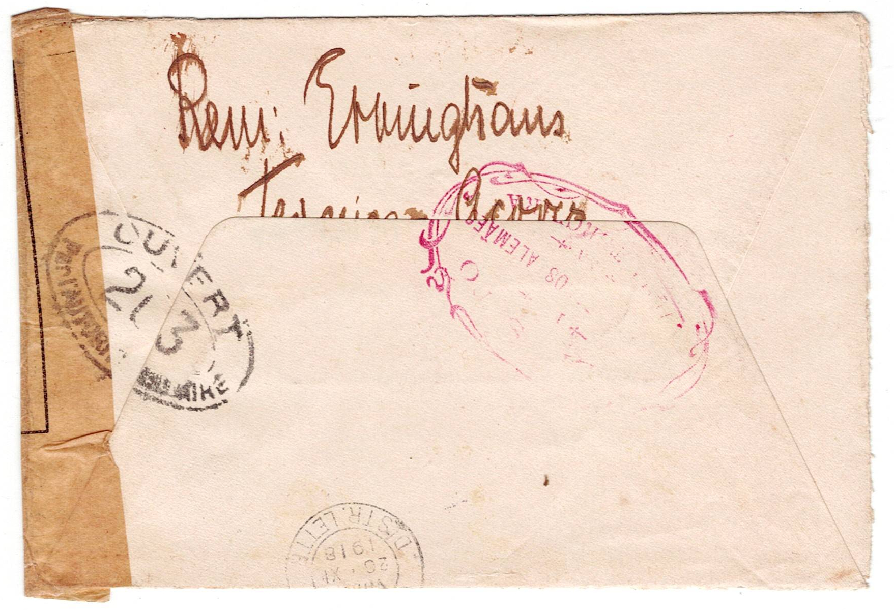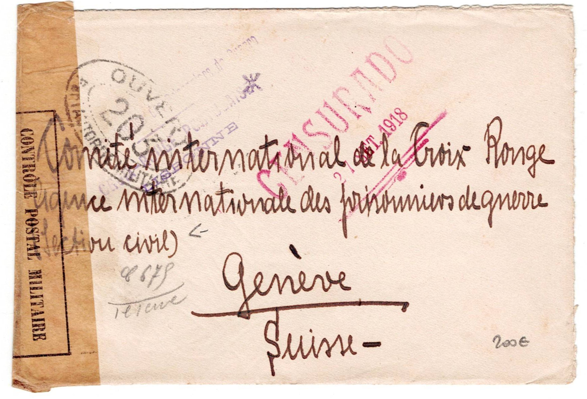 213 imageMilitary mail. WW1. First World War. Letter from a German prisoner of war in Angra do Heroísmo, marks of the German Concentrates depot, censorship mark of September 27, 1918, mark of the Lisbon Red Cross, addressed to Geneva, Switzerland, having passed through French military control.(Image 1) (Image 2)