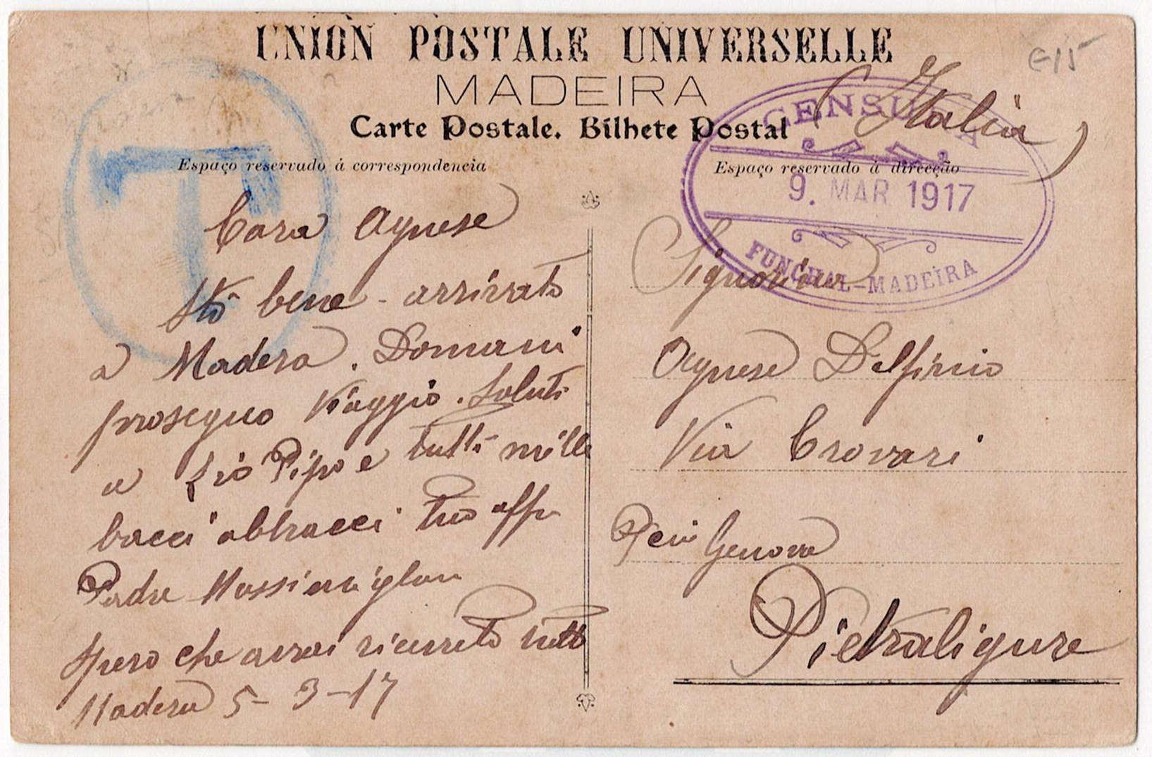 214 imageMilitary Mail. WW1. Madeira. Italy. Unfranked illustrated postcard, sent from Funchal, where it passed the Censorship on 9 March 1917, to Italy, postmarked with a T in blue pencil, probably applied in Madeira.(Image 1) (Image 2)
