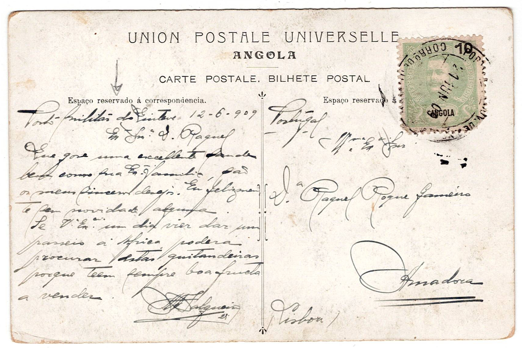215 imageMilitary Mail. Angola. Illustrated postcard, 10 reis postage D. Carlos Mouchon, issued from “Quiteve military post”on 12.6.1909, stamp rendered useless by the circular mark of Cunene on 21.6, for Portugal. MR(Image 1) (Image 2)