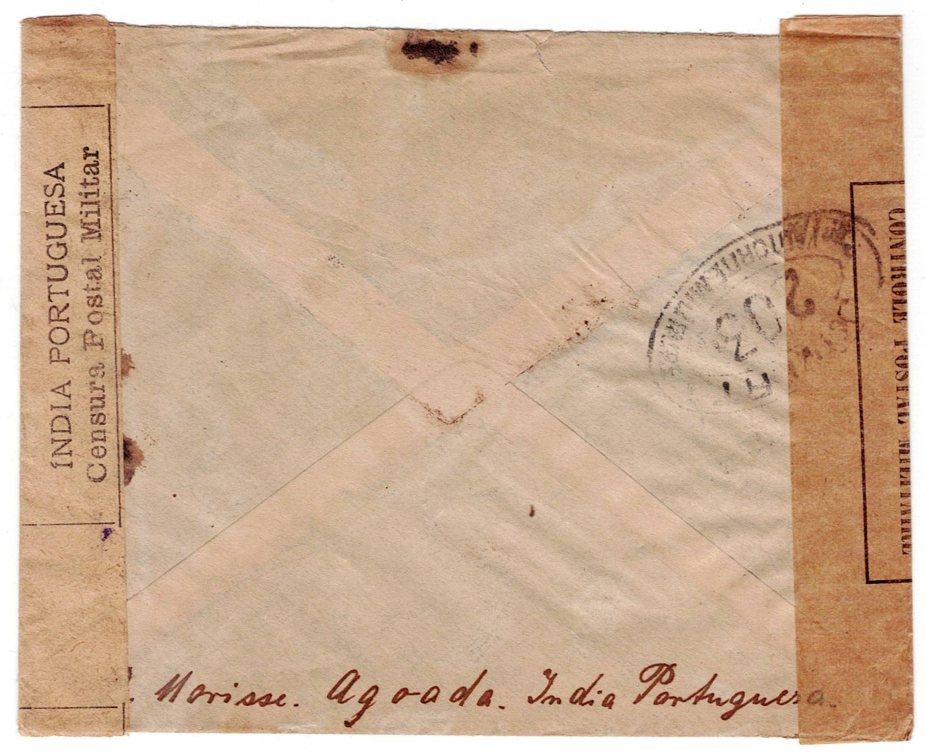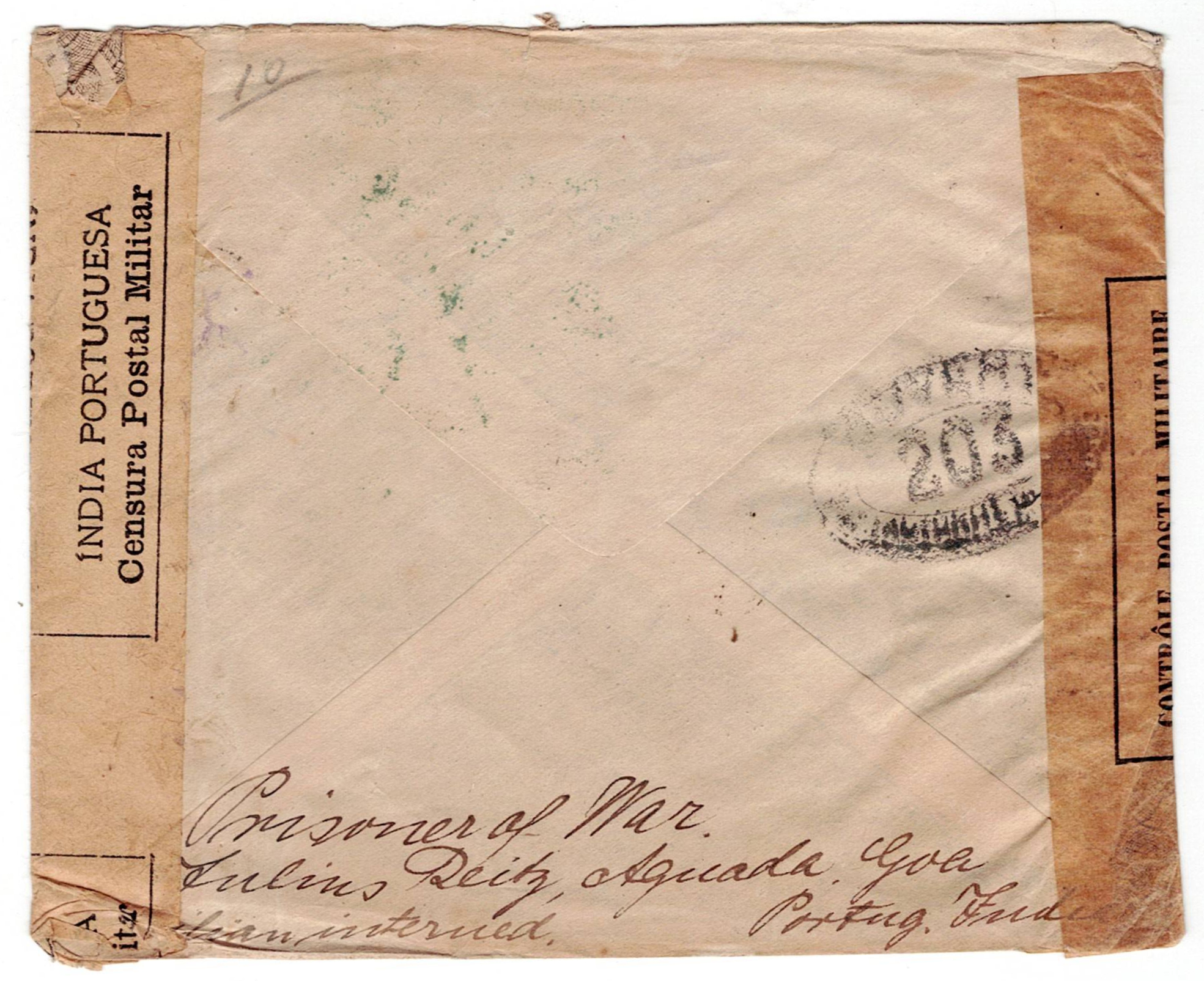 216 imageMilitary Mail. WW1. World War I. A letter from a German prisoner of war at Fort Aguada in Goa was opened by the military censor, sealed with a ribbon, marked "military censorship verified", mark of censor number 31 of Goa, mark of the Portuguese Red Cross of Lisbon; It was sent free of charge, marked "free of charge. Portuguese India."(Image 1) (Image 2)