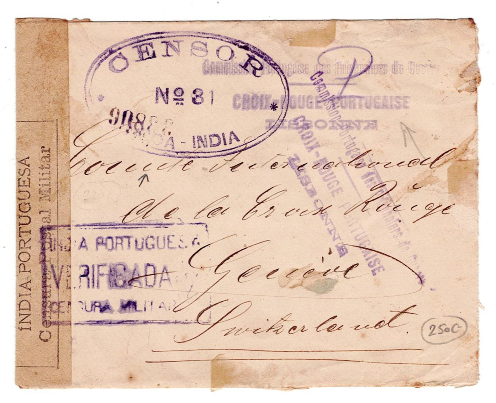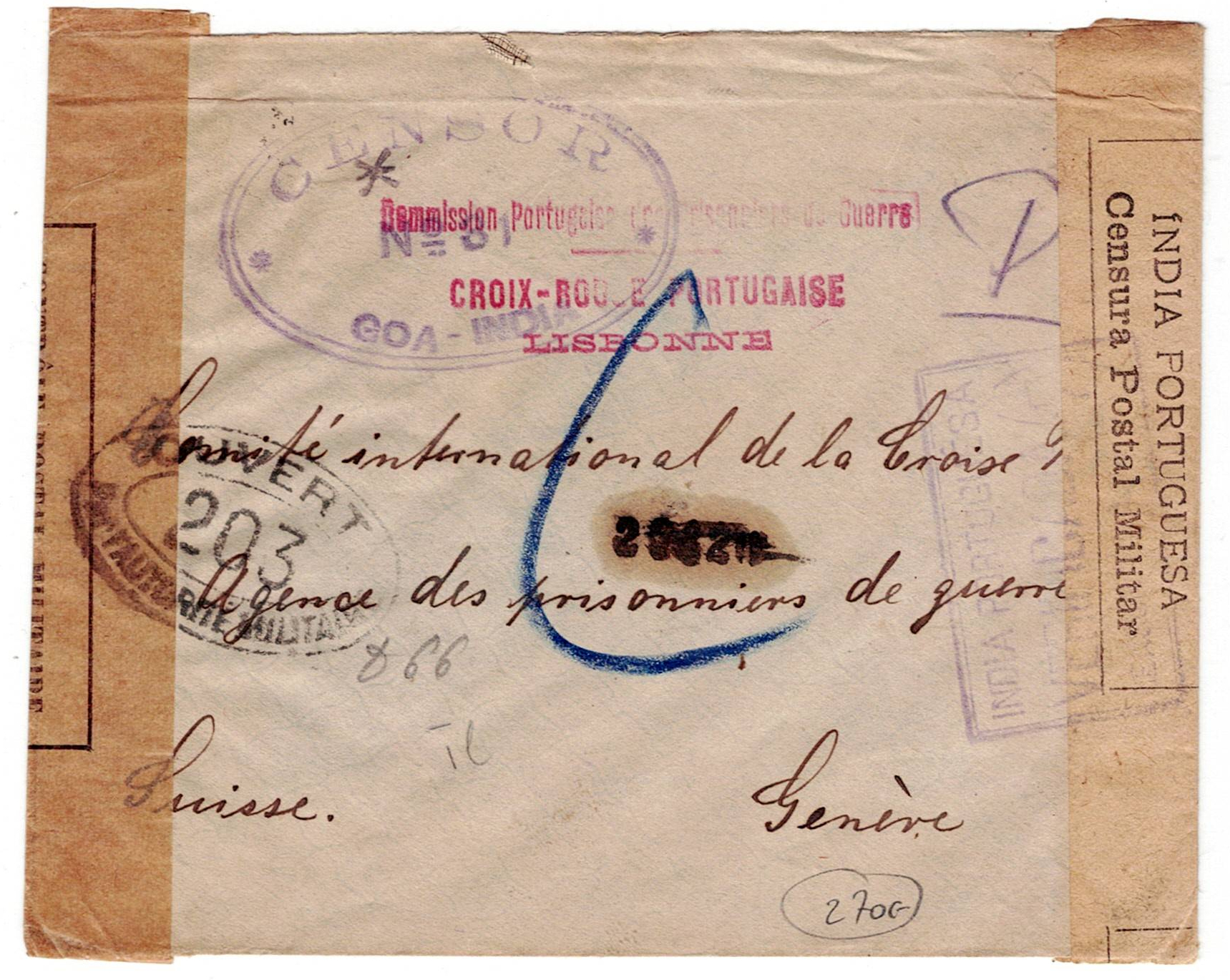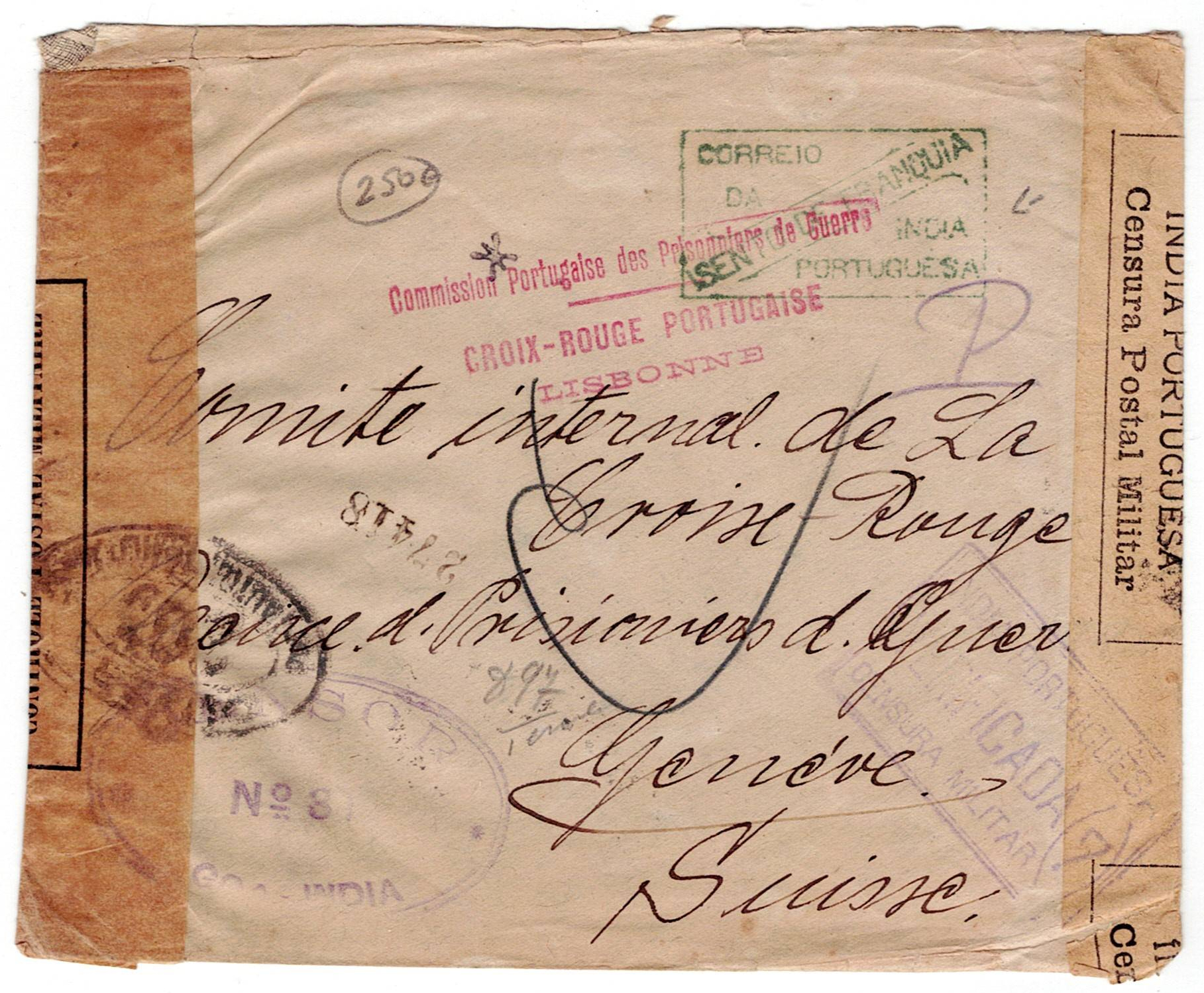 218 imageMilitary mail. WW1. First World War letter from a German prisoner of war at Fort Aguada in Goa, Passed by Censor 31 in Goa, opened by military censor in Goa, marked Portuguese India “military censorship verified”, and marked by the Portuguese Red Cross from Lisbon, to Geneva(Image 1)