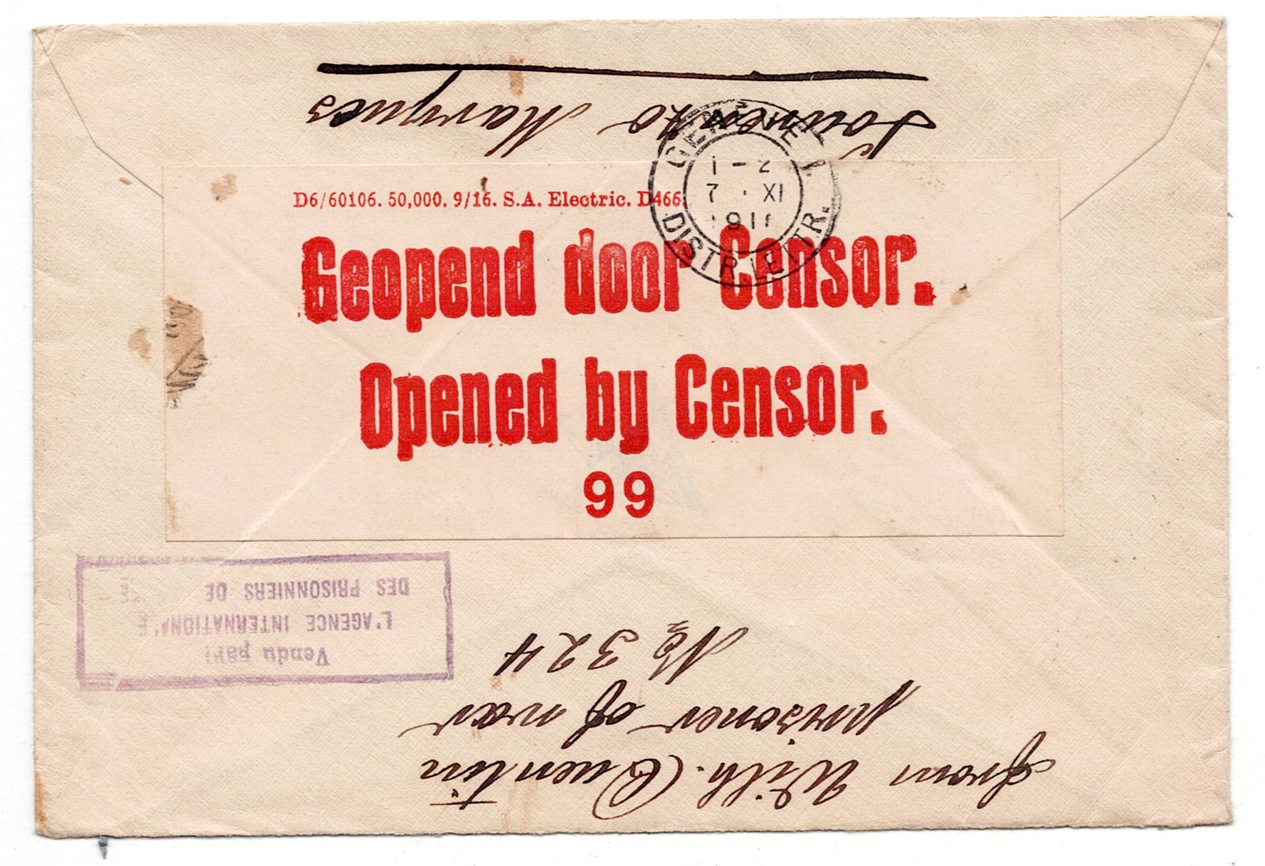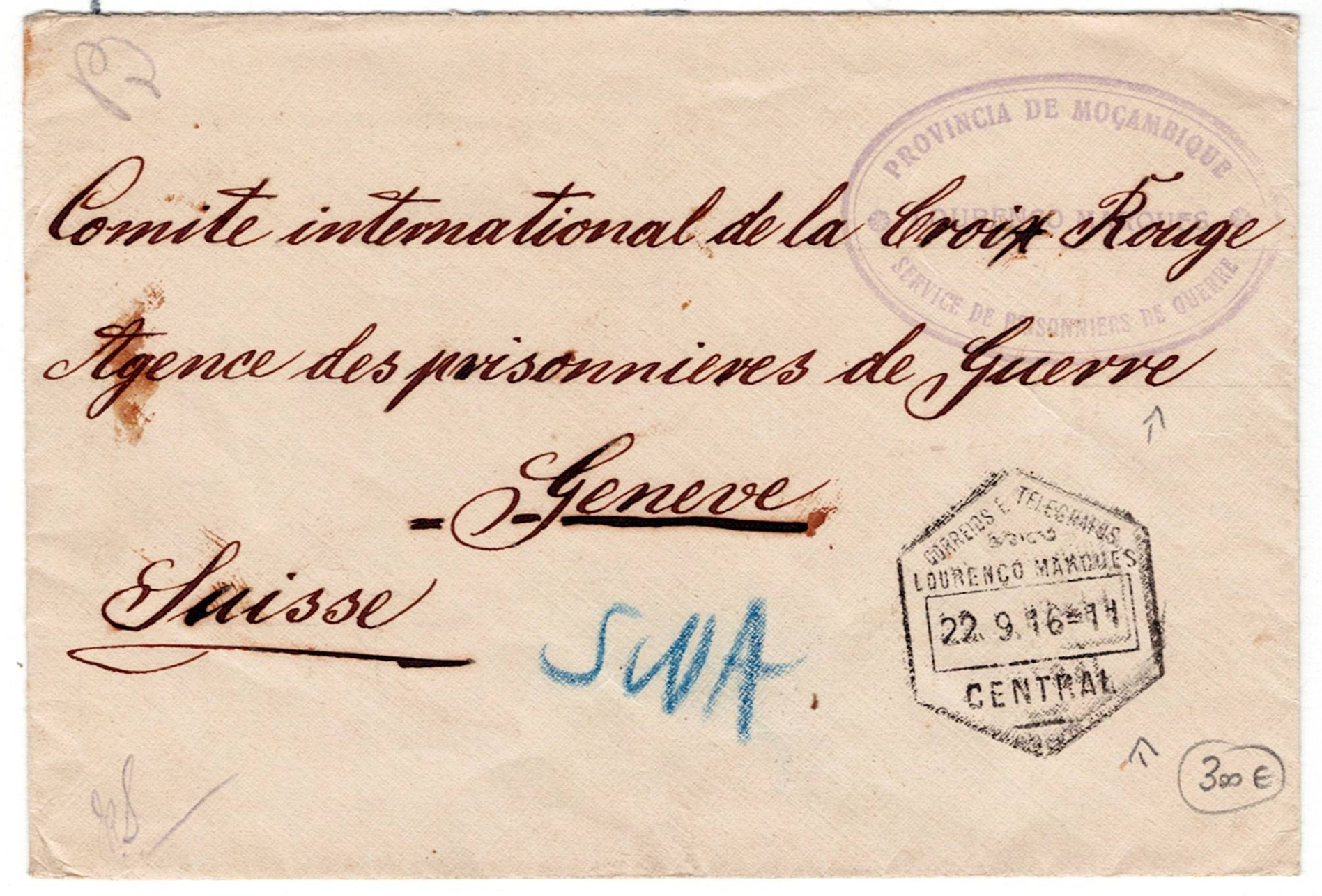 219 imageMilitary mail. WW1. First World War Letter from a German prisoner of war in Lourenço Marques dated 22/09/1916, mark of the prisoner of war service of Lourenço Marques, passed through censorship in South Africa arrived in Geneva on 7 November(Image 1) (Image 2)