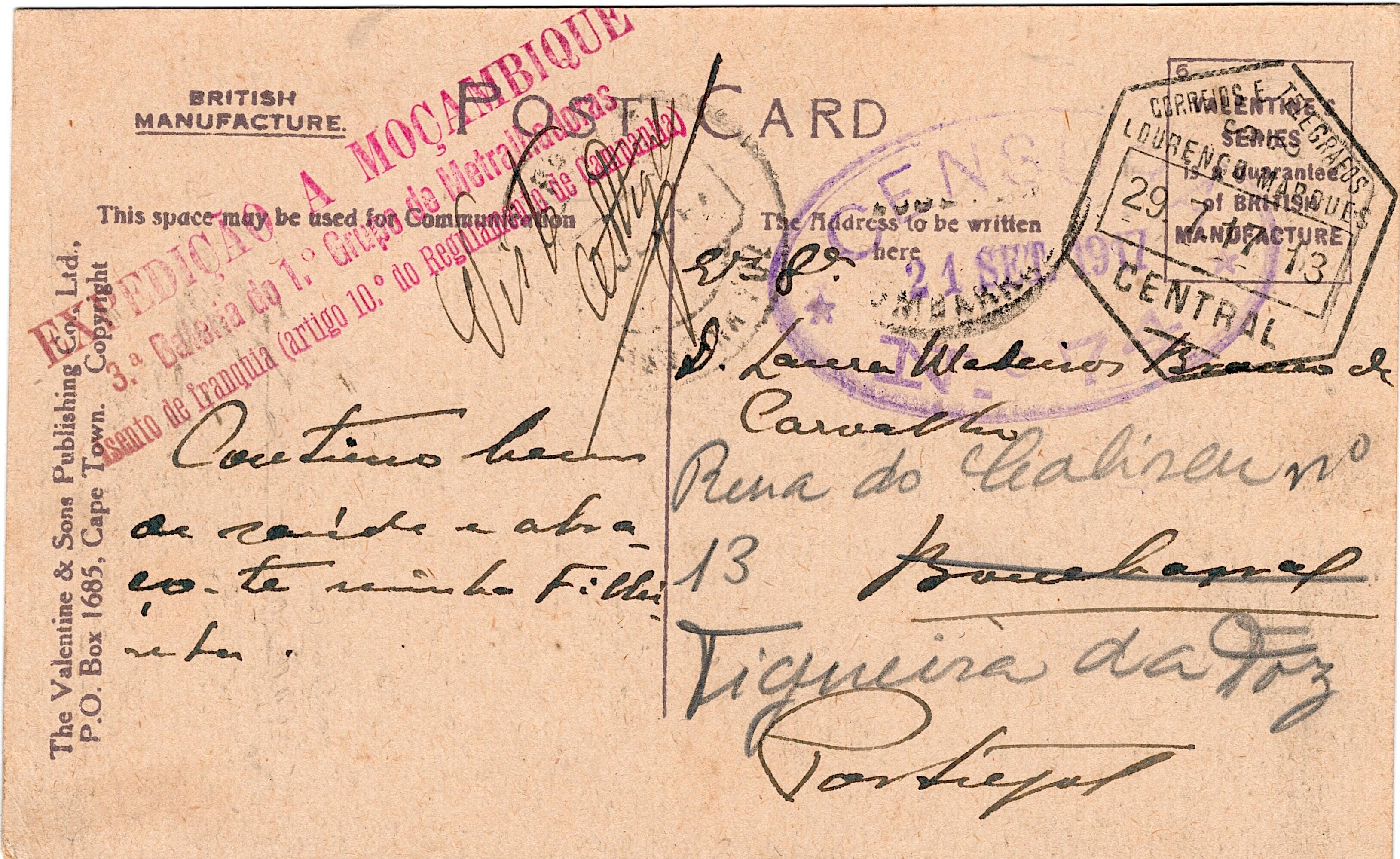 220 imageMozambique * 1914/19 – World War I. Military Expedition to Mozambique * Censorship. Illustrated postcard sent free franked, from Lourenço Marques (29.07.17) to Bombarral and re-sent to Figueira da Foz, with oval censorship postmark, struck in violet, from Lisbon (21.09.17). Militar mark in red “EXPEDIÇÃO A MOÇAMBIQUE / 3.ª BATERIA DO 1.º GRUPO DE METRALHADORAS / ISENTO DE FRANQUIA (ARTIGO 10.º DO REGULAMENTO DE CAMPANHA”. Probable handwritten censorship handwritten “Visto” with the censor signature. Postcard without damages or repairs, very well preserved.(Image 1)