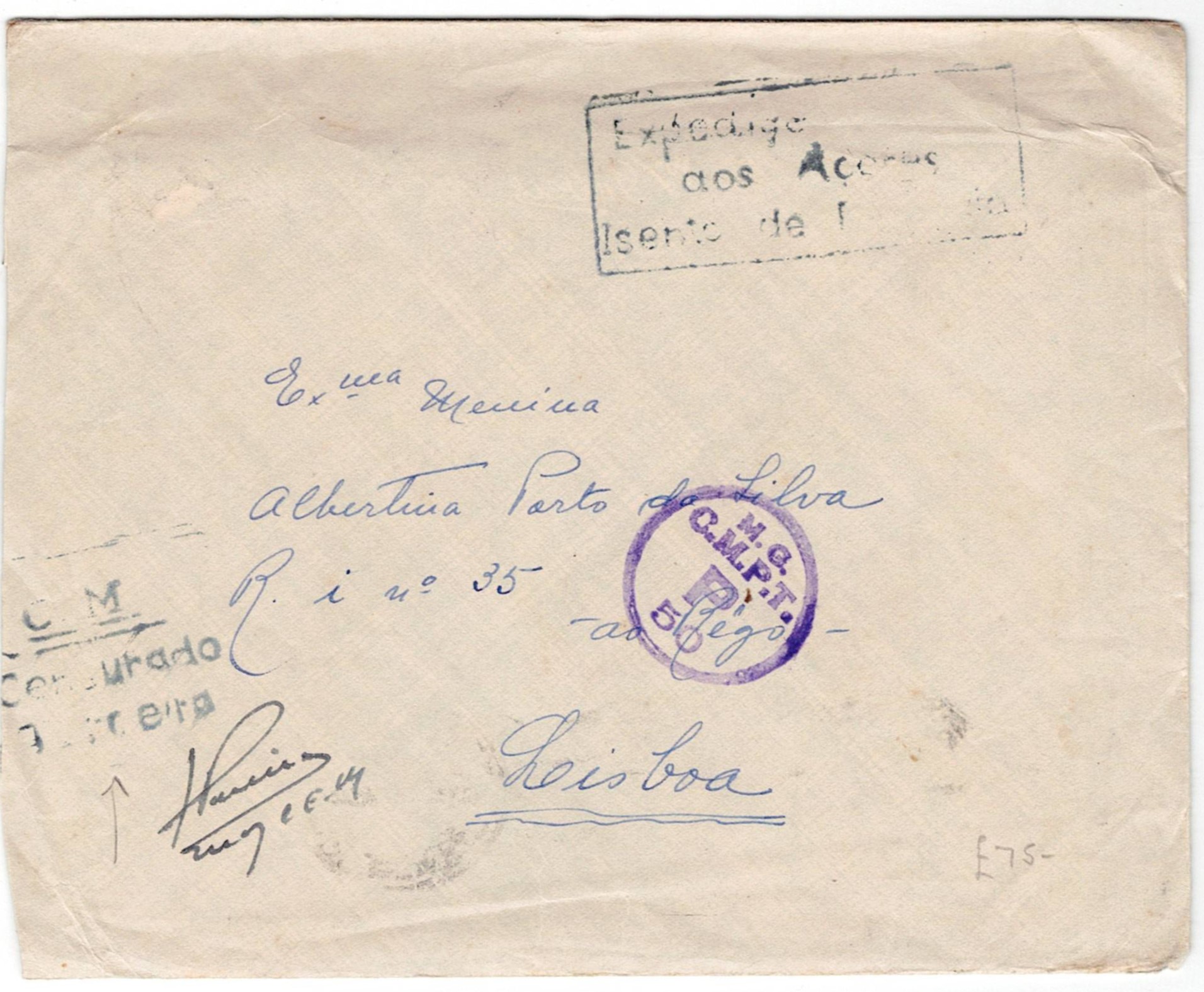221 imageMilitary Mail. Azores. Letter sent from Terceira Island on January 22, 1945, to Lisbon, exempt from postage, with marks of the MILITARY EXPEDITION to the AZORES/EXEMPT FROM POSTAGE, and two marks of Censorship in Terceira, with the signature of the Censor(Image 1)