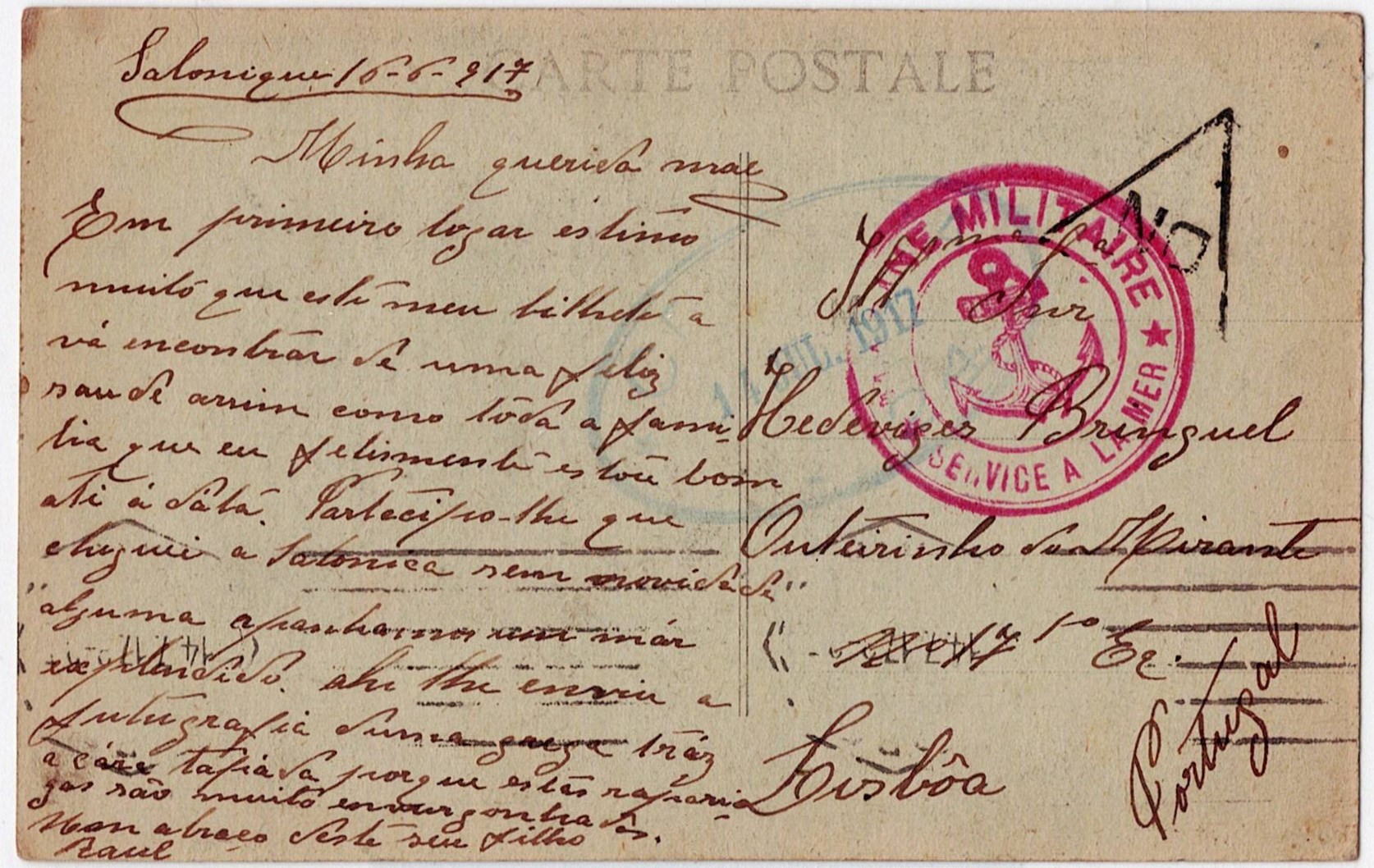 222 imageMilitary Mail. WW1. Postcard written in Thessaloniki on 16 June 1917, free of postage, written by a Portuguese soldier embarked on board a French ship, marked Franchise Militaire/Serviçe à la MER, censorship mark on arrival in Lisbon.(Image 1)