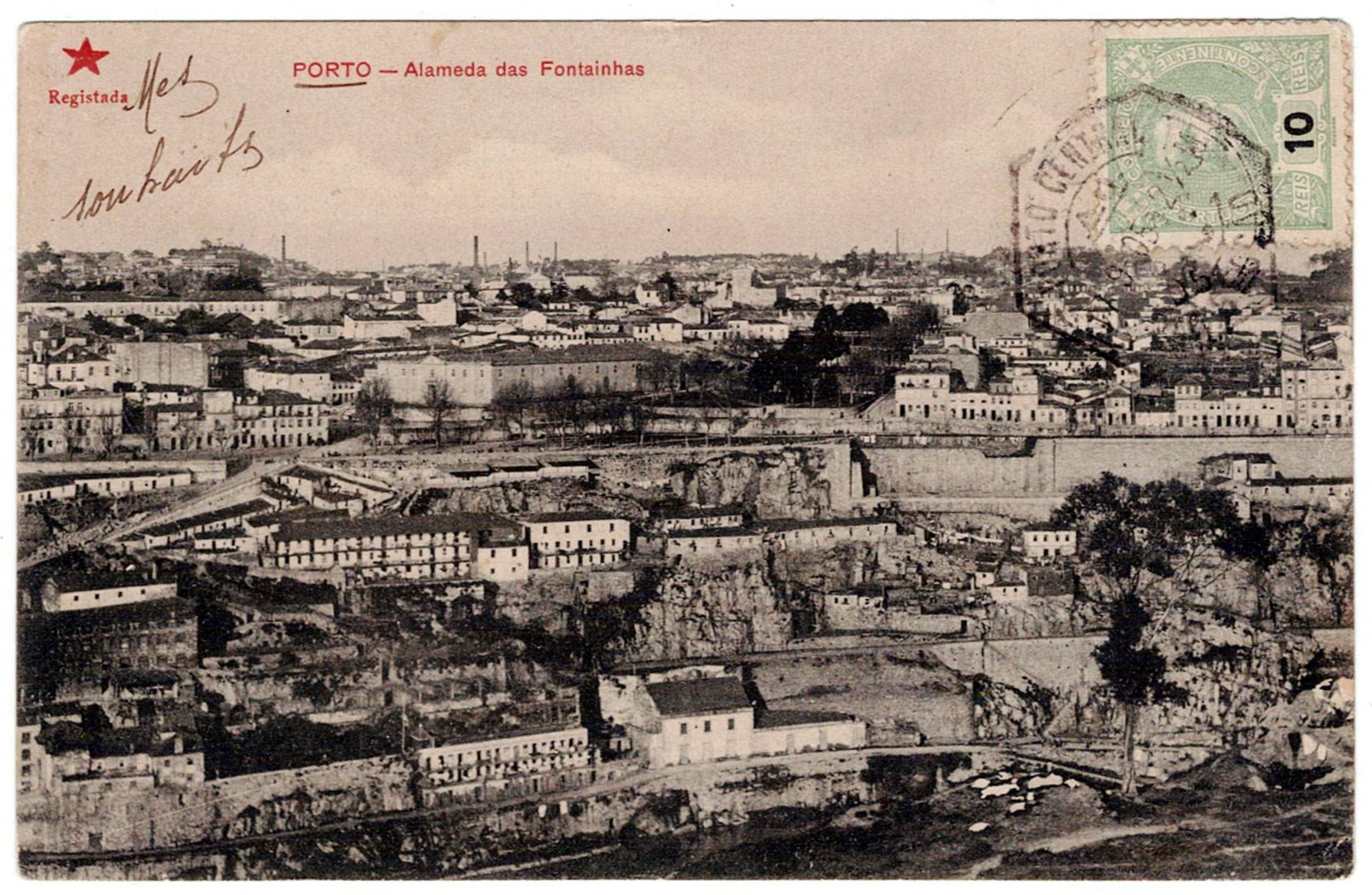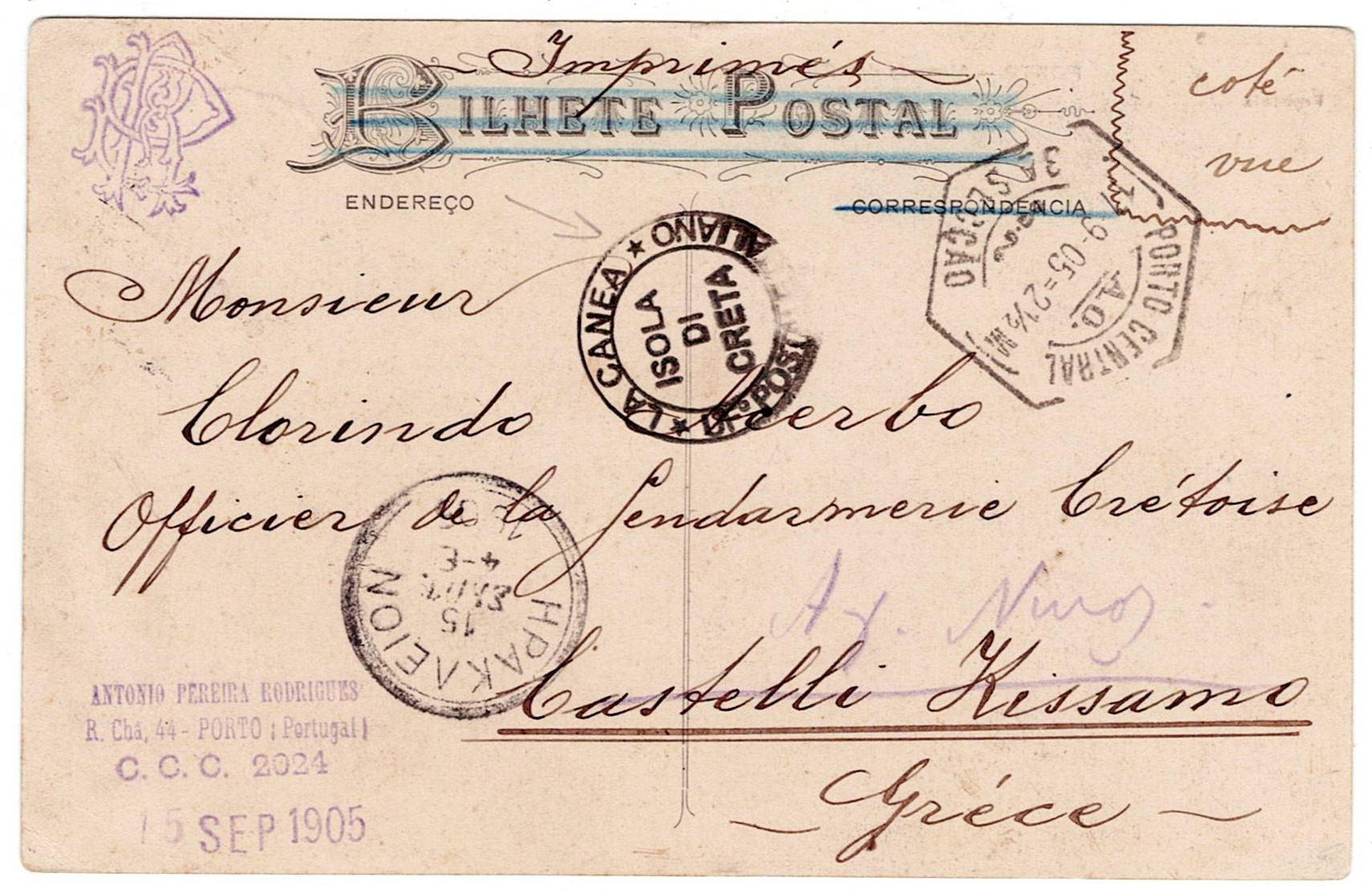 223 imageMilitary Mail. WW1, Illustrated postcard, written from Porto on 17 September 1905, to Crete, sent as printed material, postage of 10 reis (D. Carlos Mouchon)(Image 1) (Image 2)