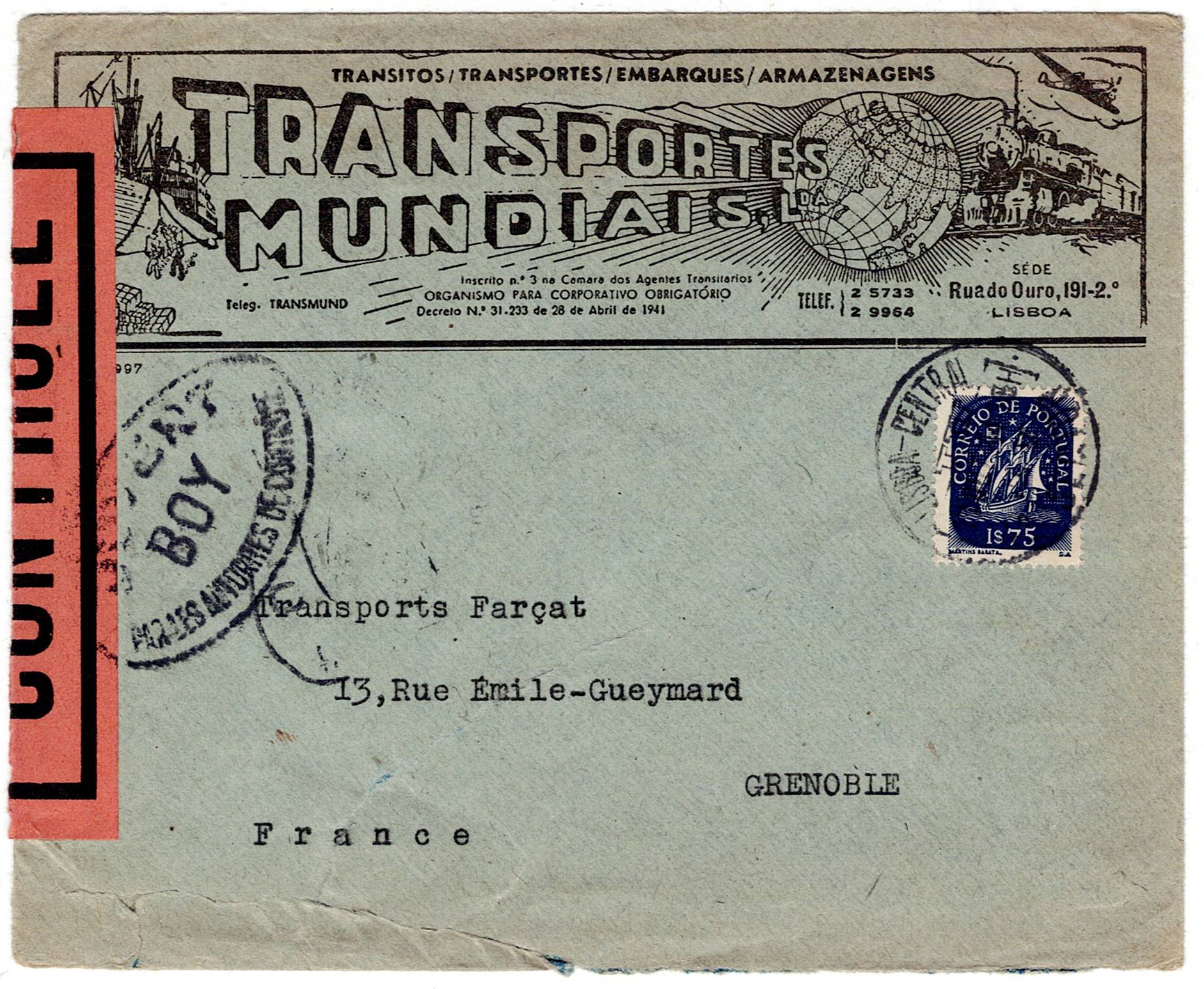 224 imageMilitary Mail. WW2. France. Portugal. Letter sent from Lisbon, postage 1$75 to Grenoble, France, opened by the French military authority, closed with CONTROL tape.(Image 1) (Image 2)