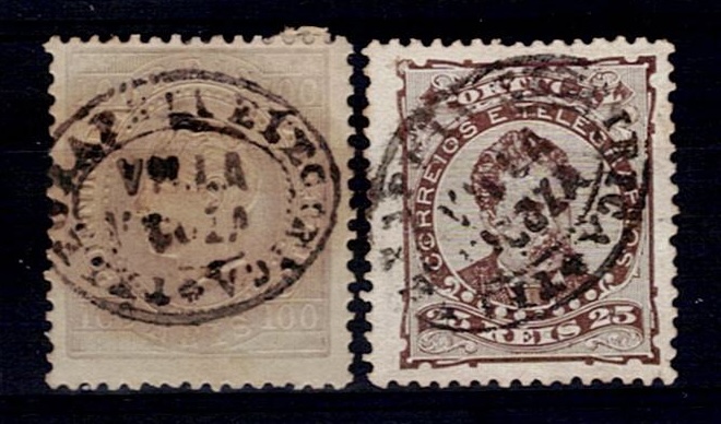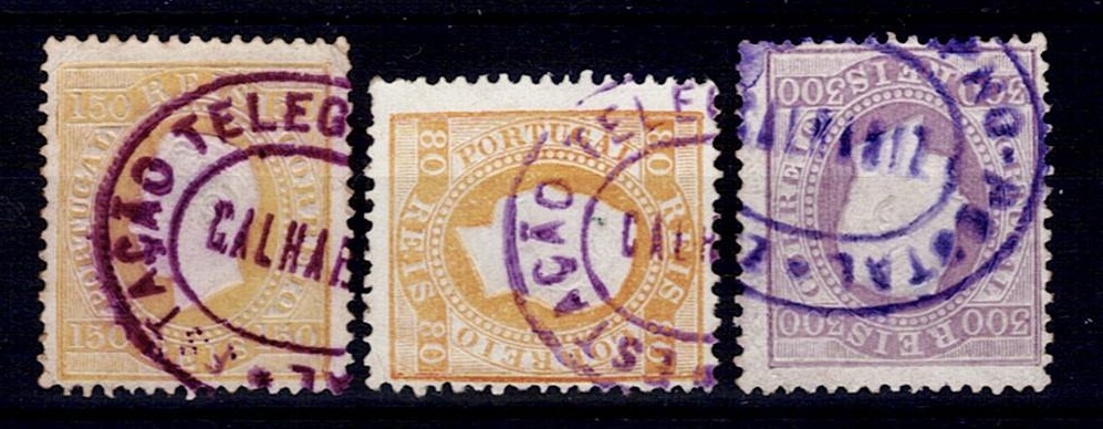 orange-yellow reis and 300 lilac reis, with postmark of the CALHARIZ telegraph station, in double oval beaten in violet.(Image 1)