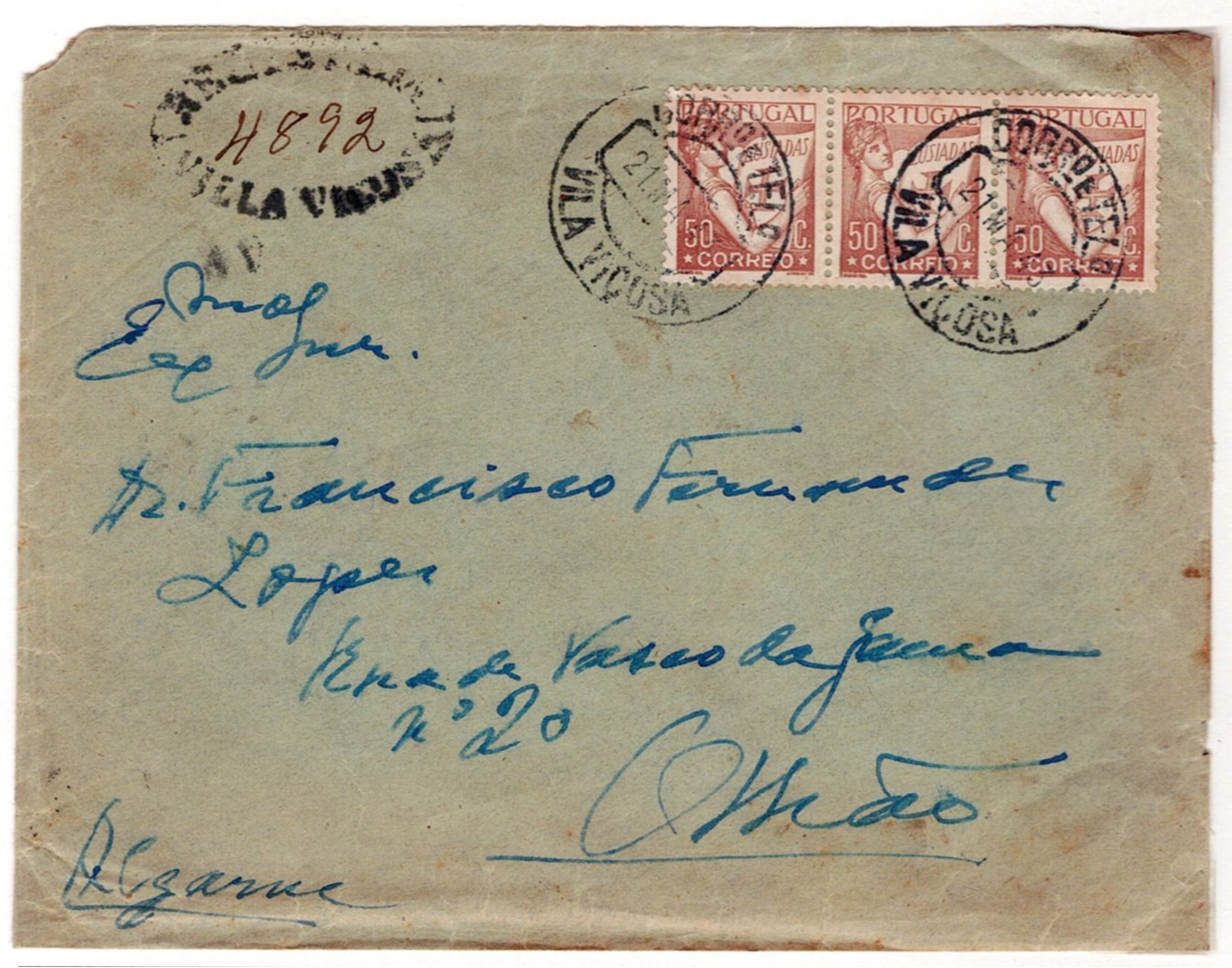 Letter sent (21.5.1943) registered (postal reform 1869 type stamp) no. 4892 by post from Vila Vicosa to